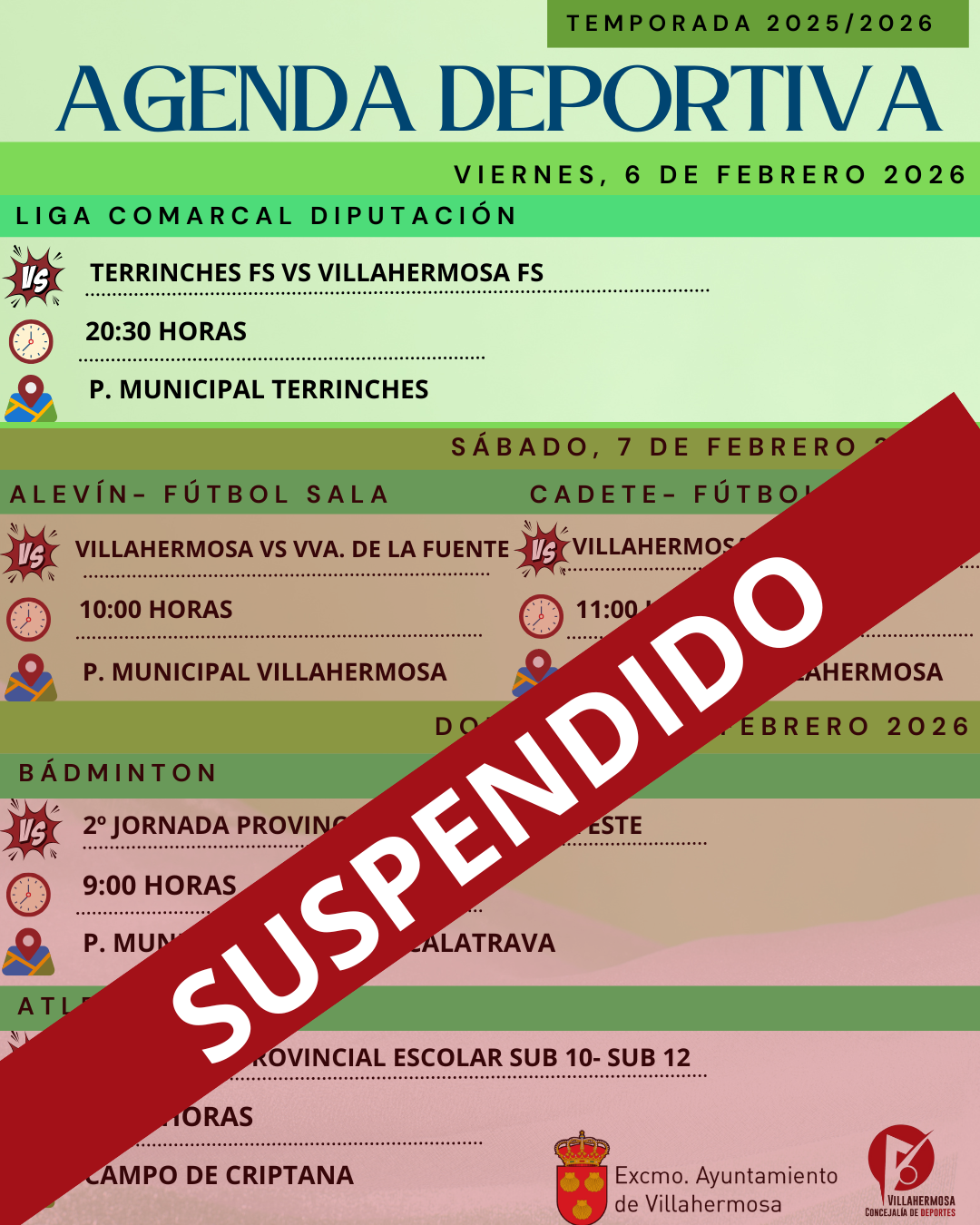 Ante este cambio de escenario y en aplicación del principio de prudencia y responsabilidad como Gobierno Regional frente a la alerta meteorológica existente, queda SUSPENDIDA la Jornada de Deporte en Edad Escolar correspondiente al fin de semana del 6 al 8 de febrero de 2026.
