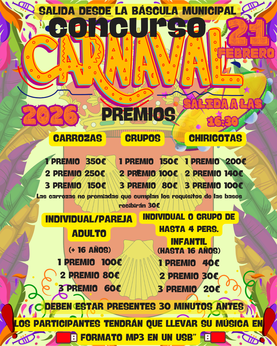 Premios para carrozas, grupos y chirigotas, e individual y pareja (adultos e infantil)