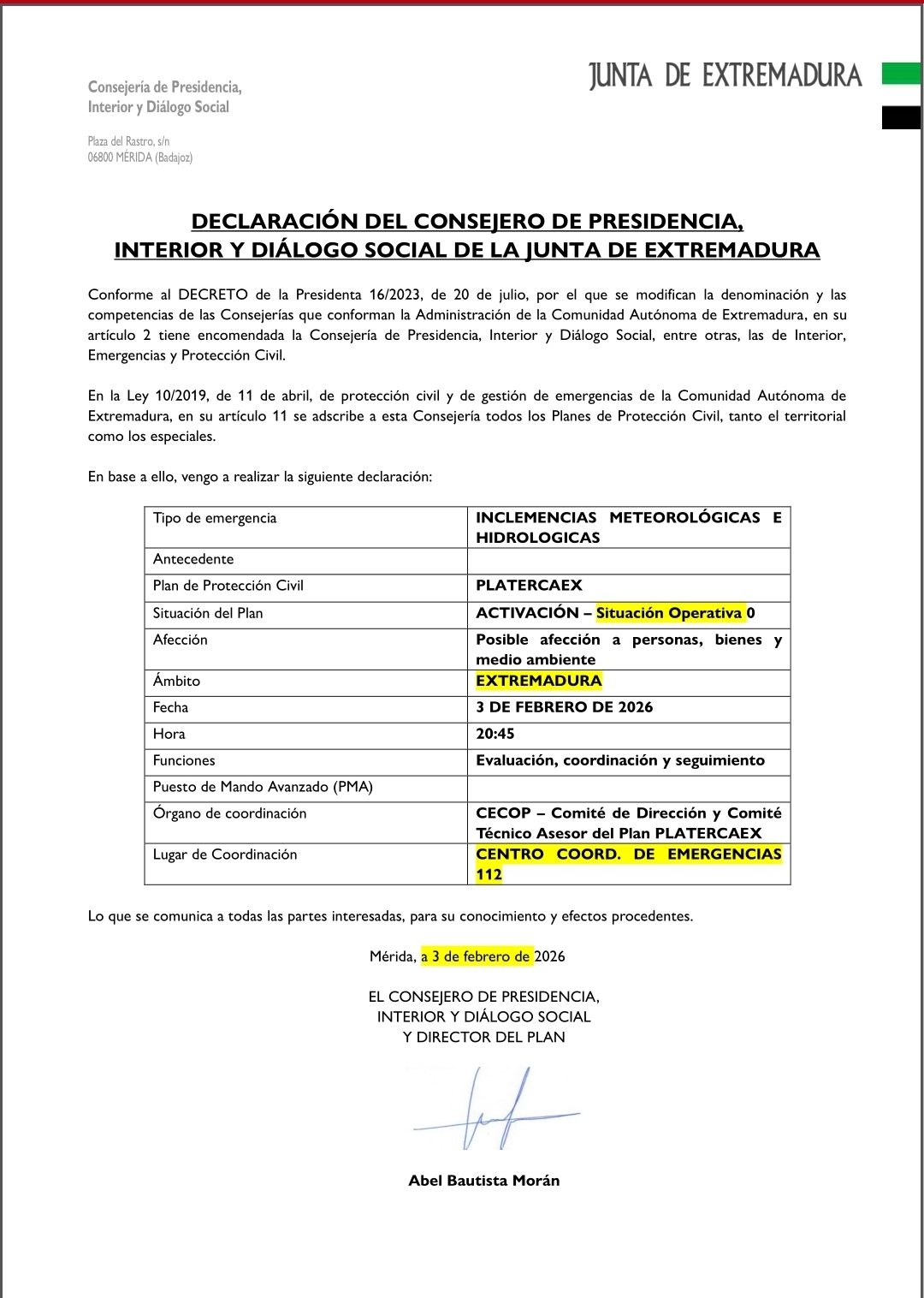 Adjuntamos el documento de activaci贸n de la fase de emergencia del plan PLATERCAEX en situaci贸n operativa 0.