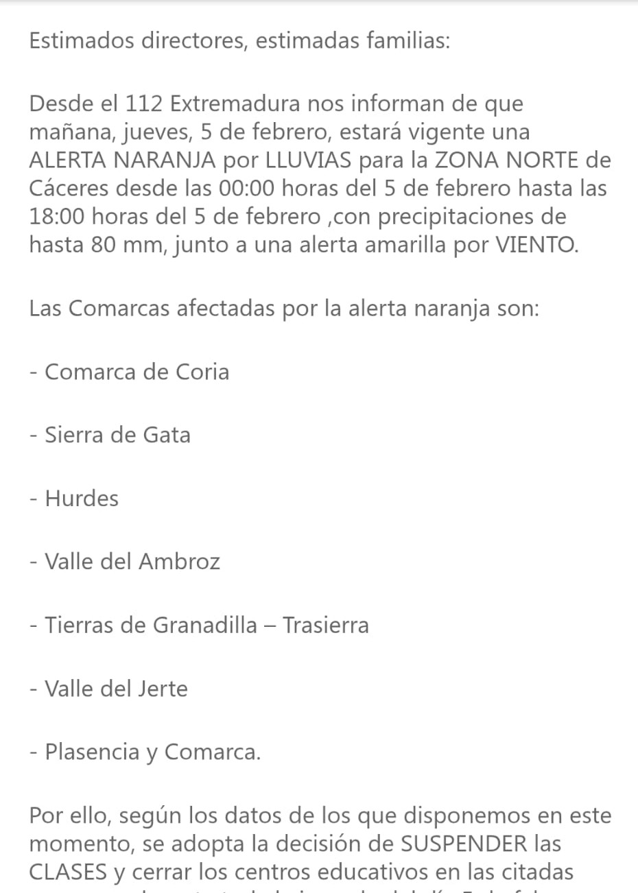 Por alerta naranja por lluvias comunicada por el 112, quedan suspendidas las clases en la zona norte de Cáceres el día 5 de febrero.