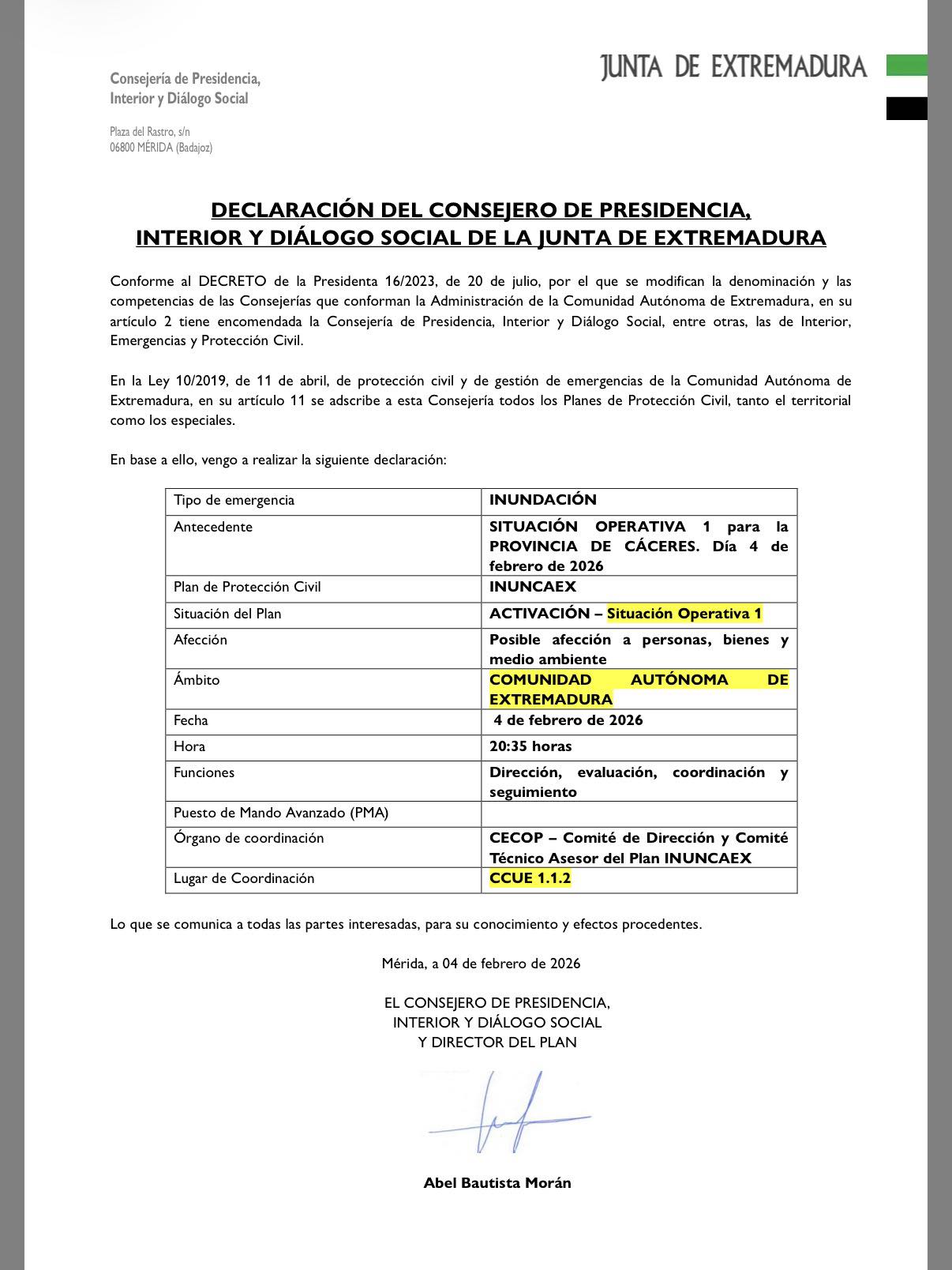 Atendiendo a las previsiones meteorológicas y parámetros hidrológicos, la Dirección del Plan INUNCAEX declara la SITUACIÓN OPERATIVA 1 para toda la Comunidad Autónoma de Extremadura dado que las previsiones siguen en aumento.