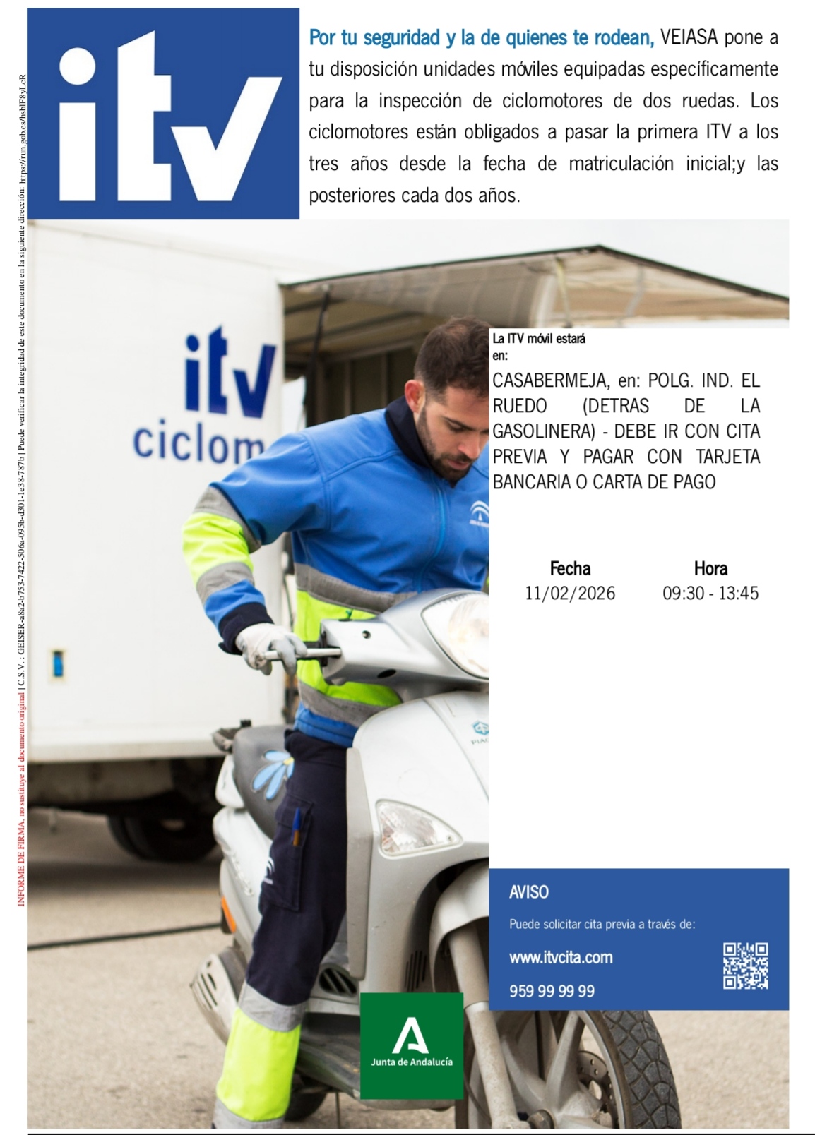 Informamos a los vecinos y vecinas que la ITV móvil para ciclomotores de dos ruedas estará próximamente en nuestro municipio.
