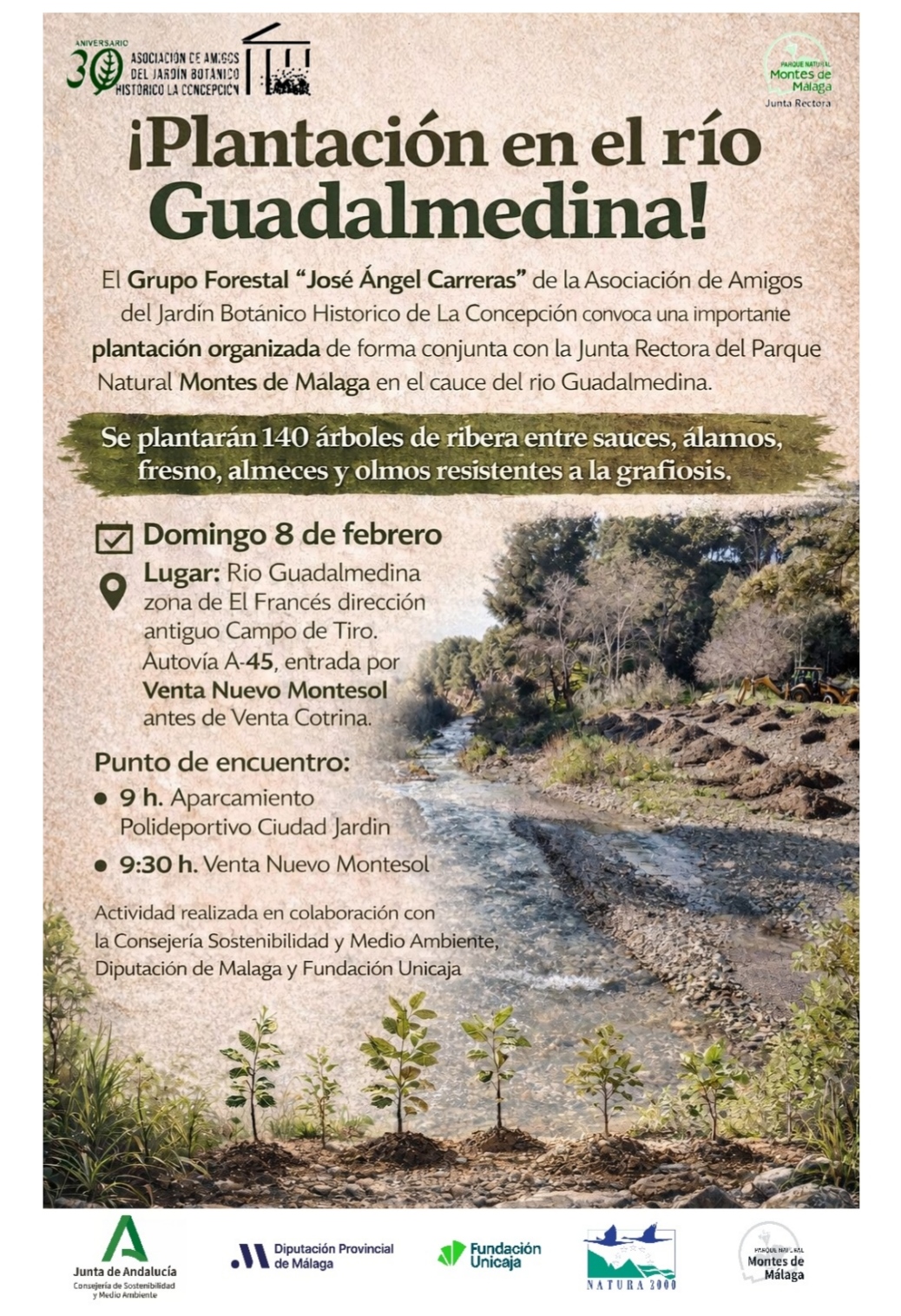 El próximo domingo 8 de febrero está prevista una jornada de plantación en el cauce del río Guadalmedina, organizada por el Grupo Forestal José Ángel Carreras junto a la Junta Rectora del Parque Natural Montes de Málaga.
