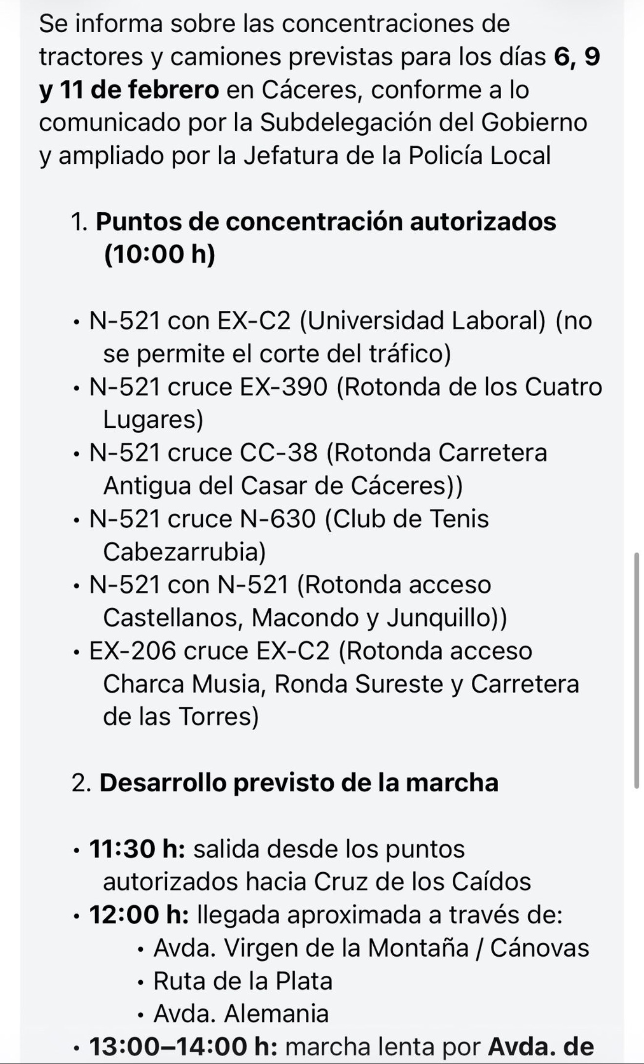 Estás concentraciones de tractores y camiones están previstas para los días 6, 9 y 11 de febrero en Cáceres, conforme a lo comunicado por la Subdelegación del Gobierno y ampliado por la Jefatura de la Policía Local.