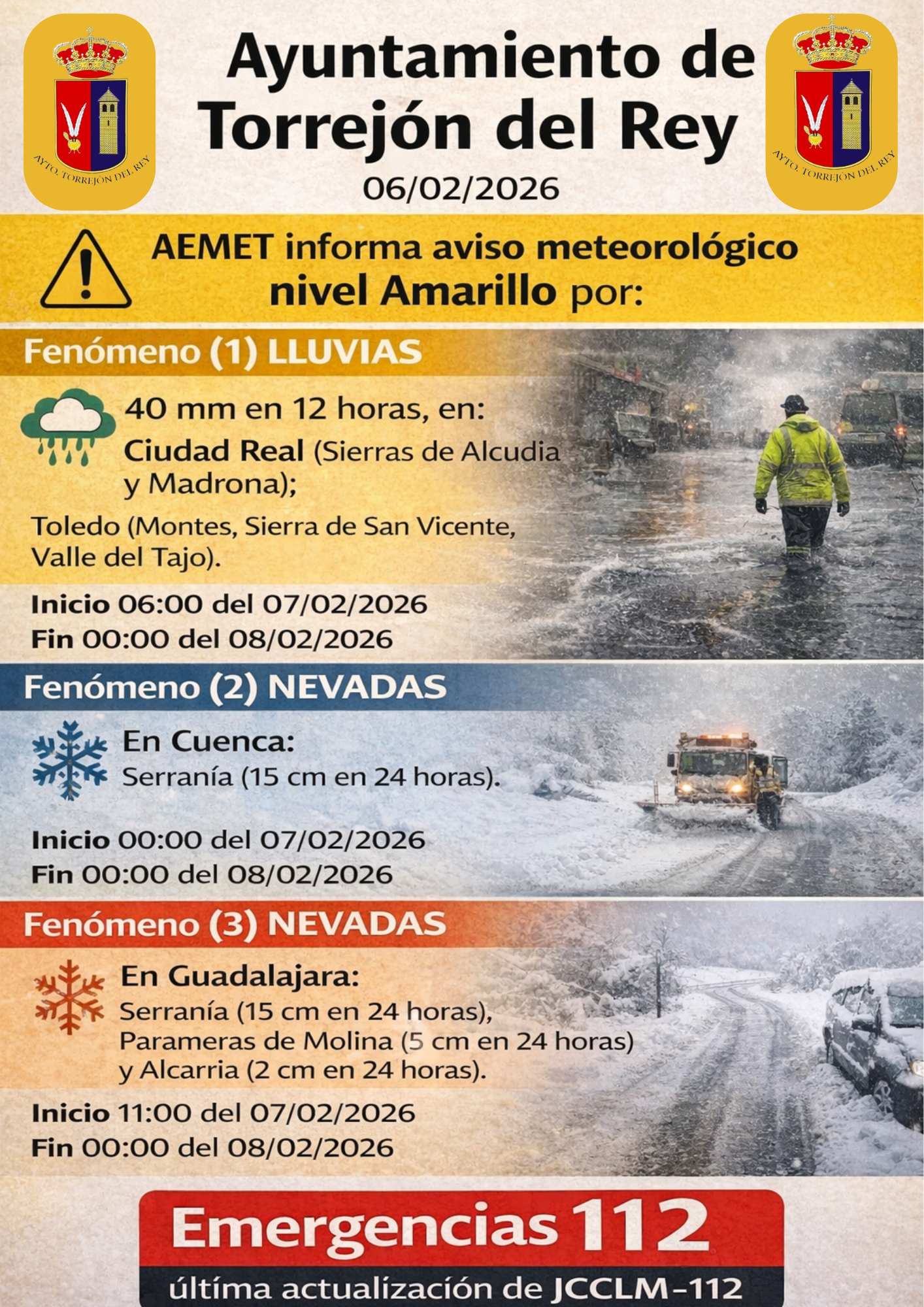 Ante la previsión de fenómenos meteorológicos adversos que pueden afectar a nuestro municipio y zonas próximas, y según la última actualización recibida de la Agencia Estatal de Meteorología (AEMET), que ha activado avisos de nivel amarillo por lluvias y nevadas, el Ayuntamiento de Torrejón del Rey informa y recomienda a la población extremar las precauciones con carácter preventivo.