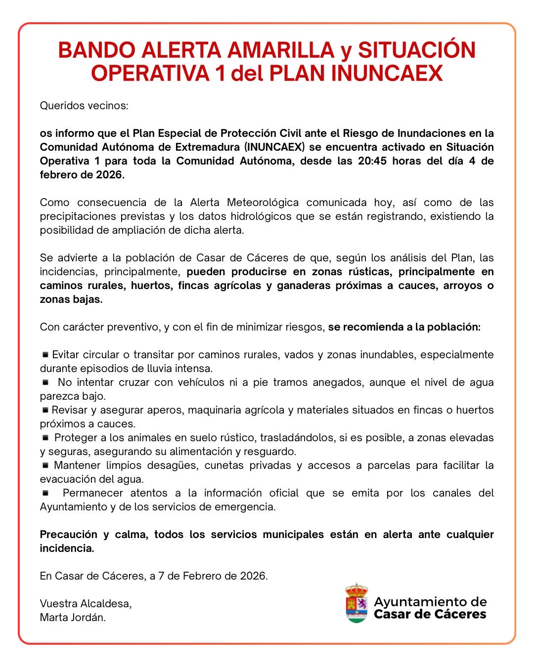 Recomendaciones: Alerta Amarilla y Plan INUNCAEX