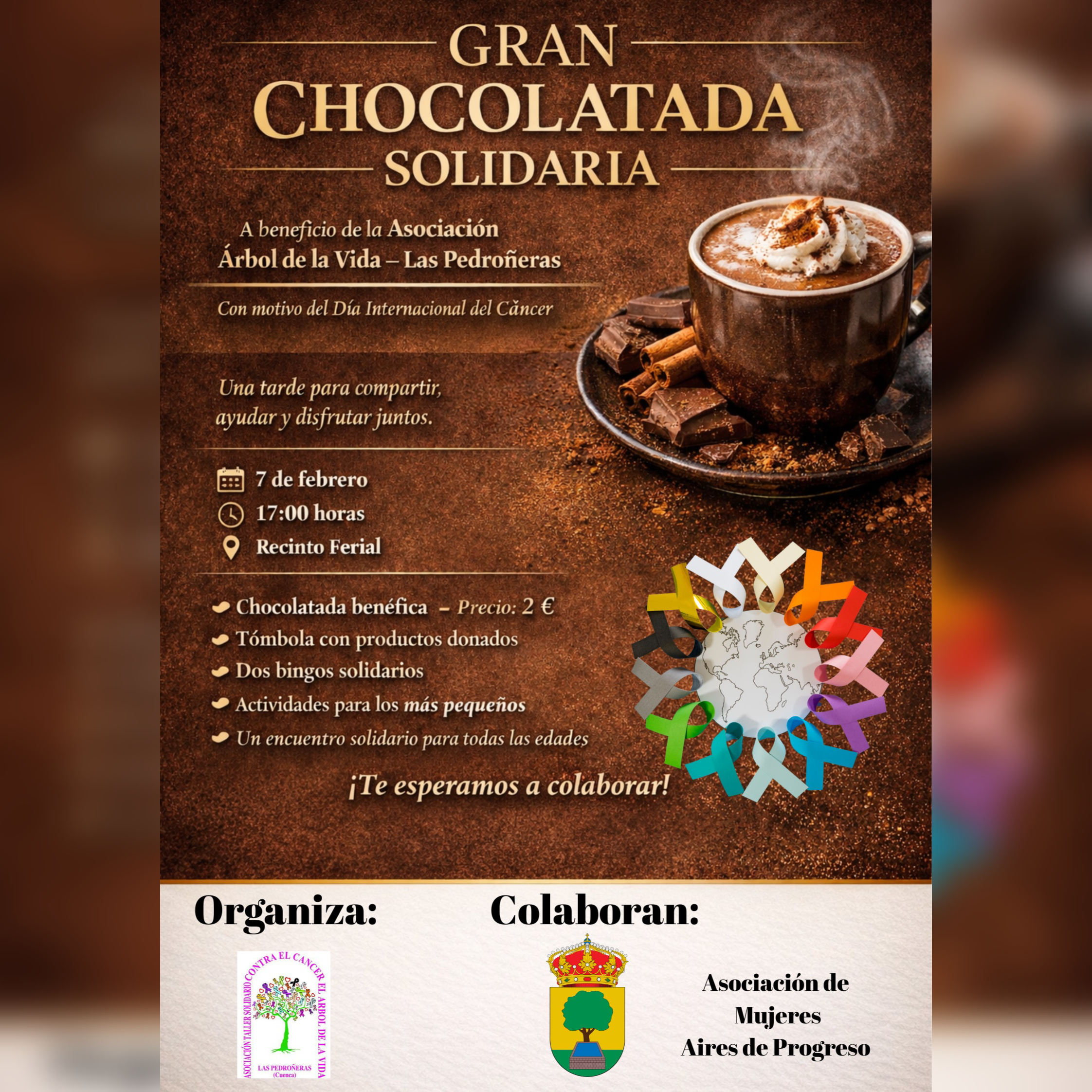 Hoy, 7 de febrero, te esperamos en el Recinto Ferial a partir de las 17:00 horas para disfrutar de una Gran Chocolatada Solidaria a beneficio de la Asociación Árbol de la Vida – Las Pedroñeras, con motivo del Día Internacional del Cáncer.