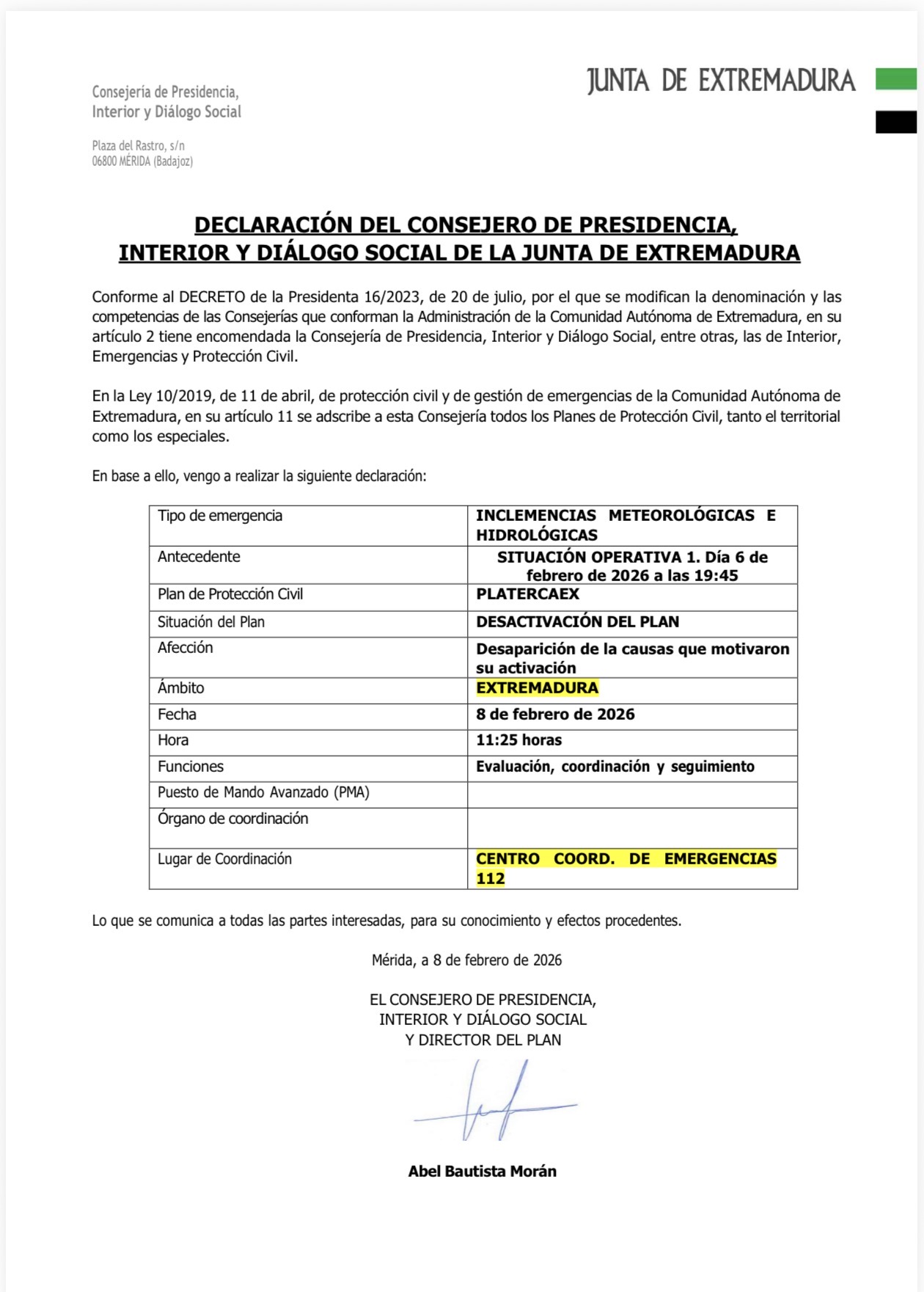 DESACTIVACIÓN del PLAN PLATERCAEX. Se recuerda que se encuentra aún activo el PLAN INUNCAEX en Situación Operativa 1 por los datos hidrológicos que aún se continúan registrando.