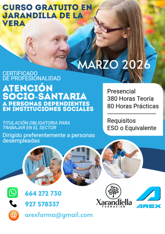Adjuntamos información de interés sobre curso gratuito de Atención sociosanitaria a personas dependientes en instituciones sociales, en Jarandilla de la Vera y con Certificado de Profesionalidad.