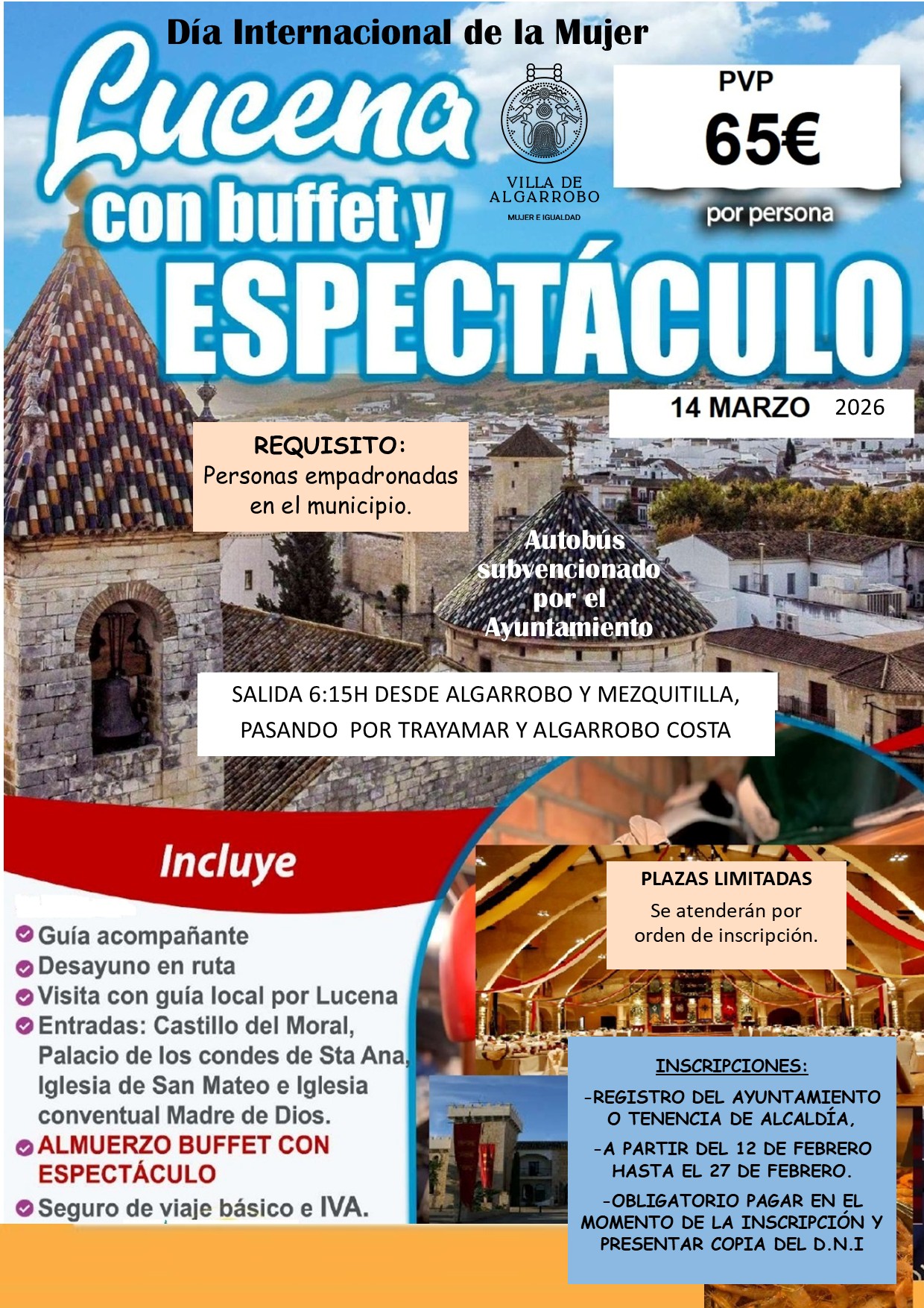 El 14 de marzo de 2026 viajamos a Lucena para disfrutar de un día especial con 🚌 autobús subvencionado, 🥐 desayuno en ruta, 🏛️ visita guiada y 🍽️ almuerzo buffet con espectáculo, todo por 65 € por persona. ⏰ Salida a las 6:15 h desde Algarrobo y Mezquitilla. 📌 Plazas limitadas para personas empadronadas. 📝 Inscripciones del 12 al 27 de febrero en el Ayuntamiento. 🌸 ¡Celebra este día único con nosotras! 💃🎭