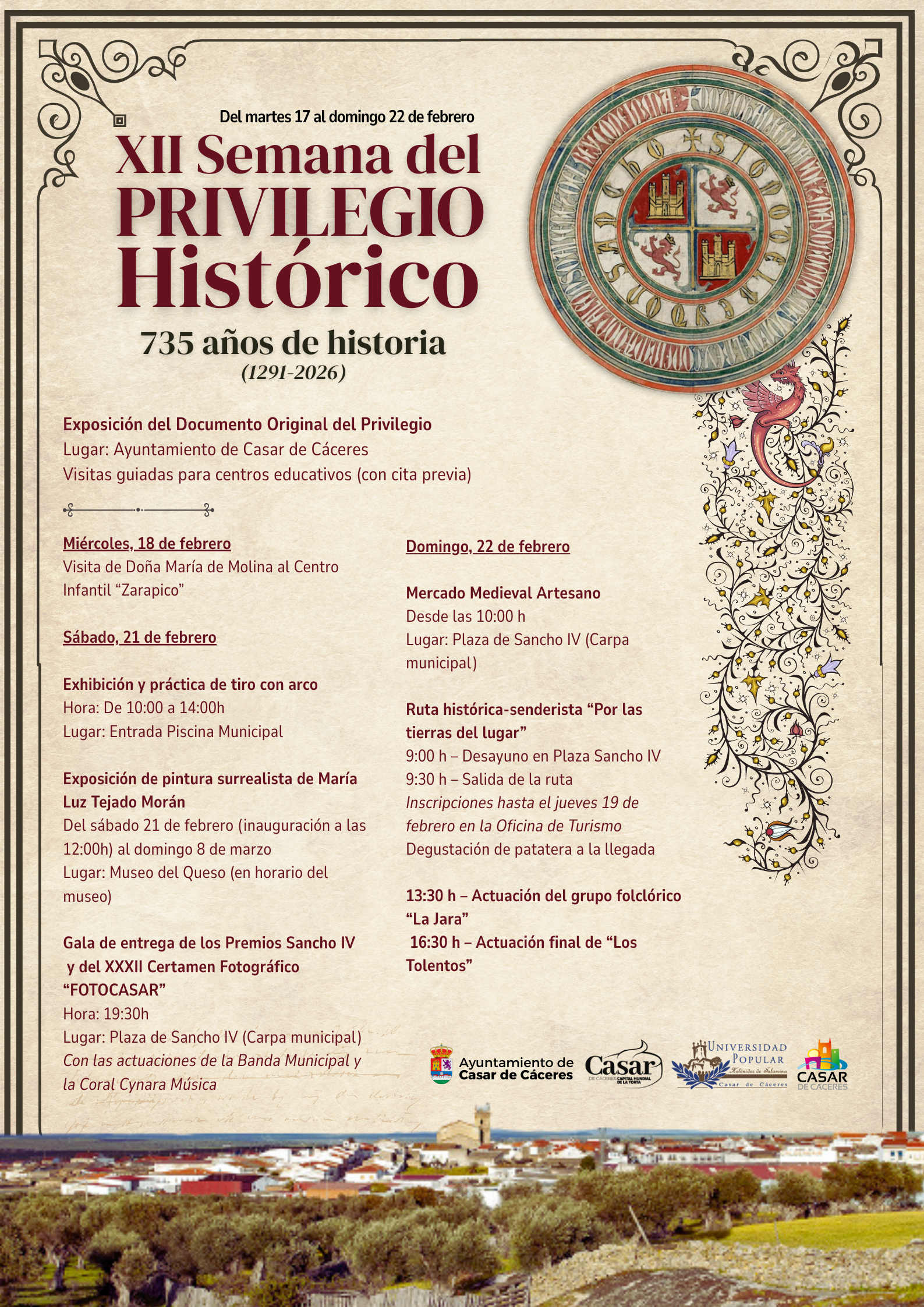 🏰📜 Del 17 al 22 de febrero celebramos la XII Semana del Privilegio Histórico de Sancho IV. Una semana donde revivimos nuestra cultura y ponemos en valor nuestra historia.🗓️ Consulta el programa completo y no te pierdas nada! 👏🏼#casardecaceres