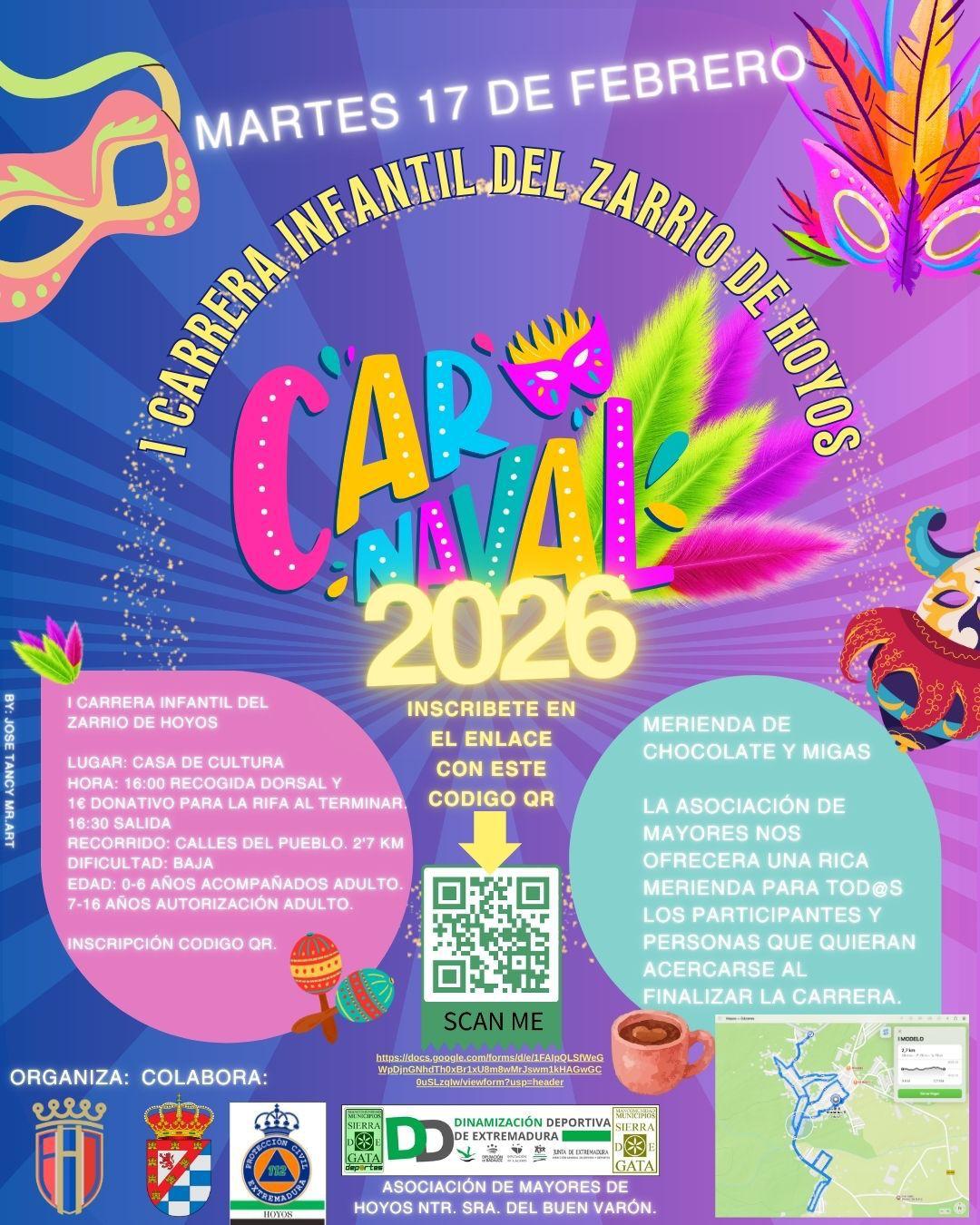 📢 El Ayuntamiento recuerda el programa de actividades del Carnaval Hoyos 2026, que da inicio mañana jueves. Invitamos a toda la vecindad a participar en las actividades organizadas por el Ayuntamiento y Asociaciones.