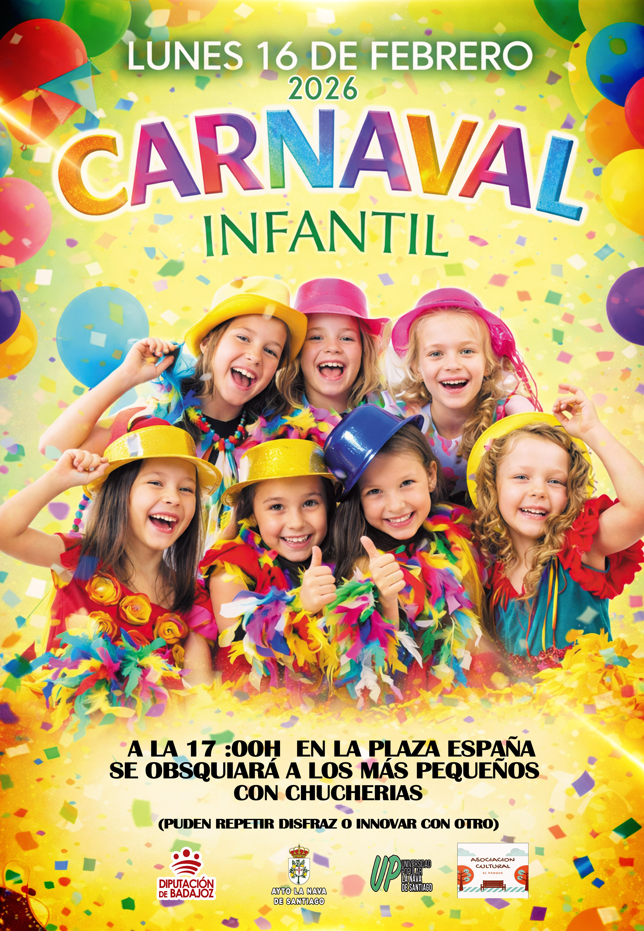 La Asociación Cultural "El parque", Universidad Popular, con la colaboración de la Diputación de Badajoz y el Ayuntamiento de La Nava de Santiago, ha organizado un evento lleno de alegría y diversión. ¡No te pierdas la oportunidad de disfrutar del Carnaval en familia!