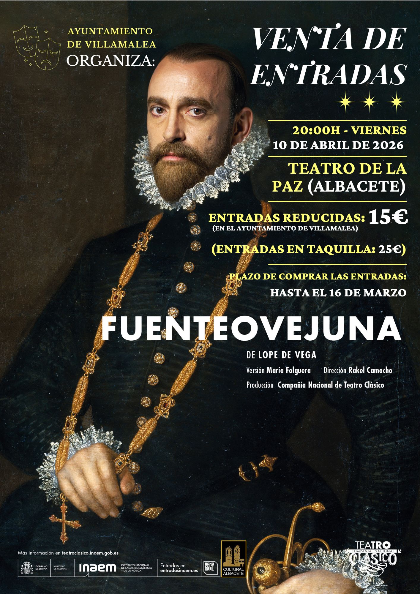 - VENTA DE ENTRADAS a precio reducido de 15€ para ver la obra de teatro FUENTEOVEJUNA (una de las obras más emblemáticas del Siglo de Oro español), a cargo de la Compañía Nacional de Teatro Clásico. (las entradas en taquilla son a 25€)