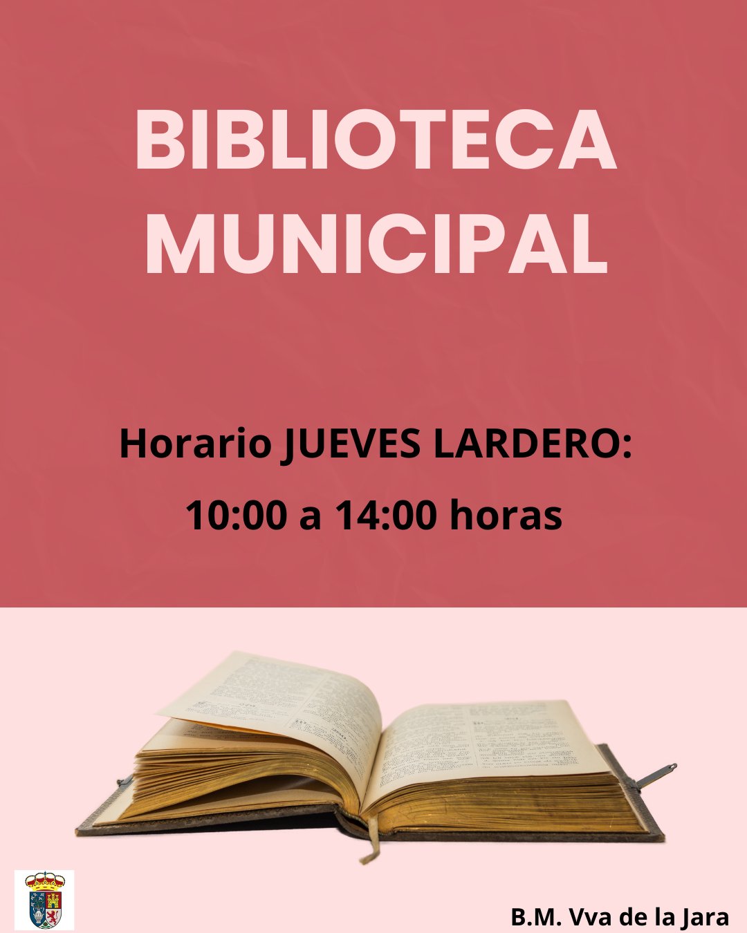 Con motivo de Jueves Lardero, la Biblioteca Municipal tendrá un horario especial: 🕙 De 10:00 a 14:00 horas Gracias por vuestra comprensión.(ver cartel adjunto)