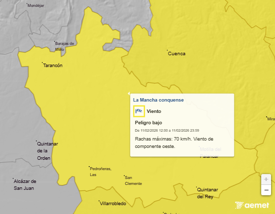 La Agencia Estatal de Meteorología (AEMET), ha activado desde las 12:00H del día de hoy, hasta las 00:00H del sábado 14 de febrero el aviso de nivel amarillo por fuertes vientos (rachas máximas de hasta 70 km/h) en la Mancha Conquense.