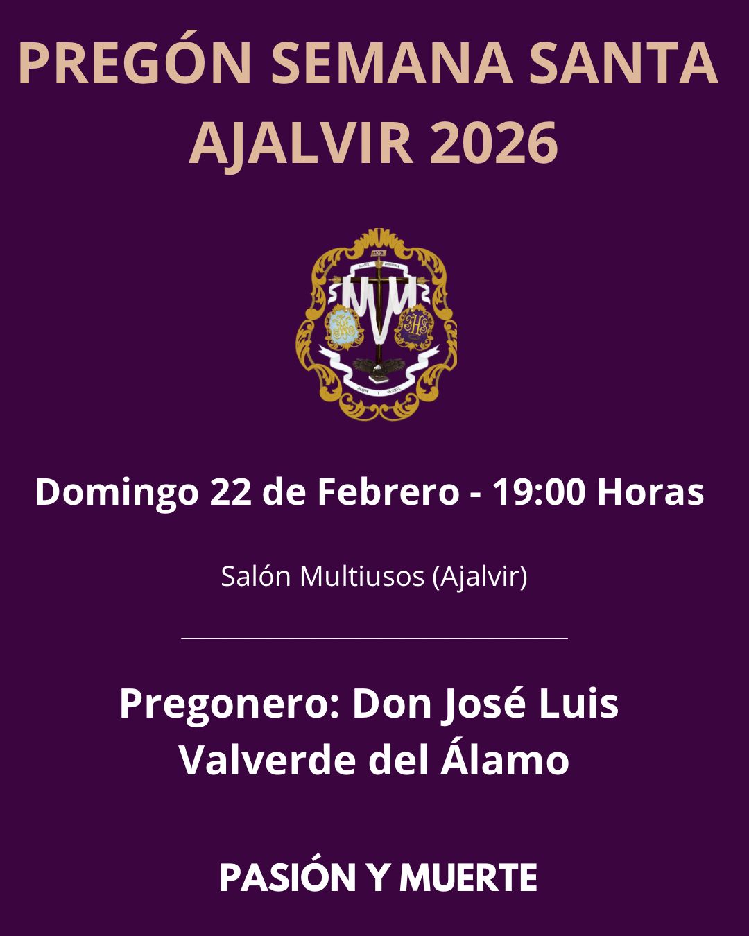 PREGÓN DE SEMANA SANTA 2026 Domingo 22 de Febrero 19:00h Sala Multiusos Pregonero : Don José Luis Valverde del Álamo