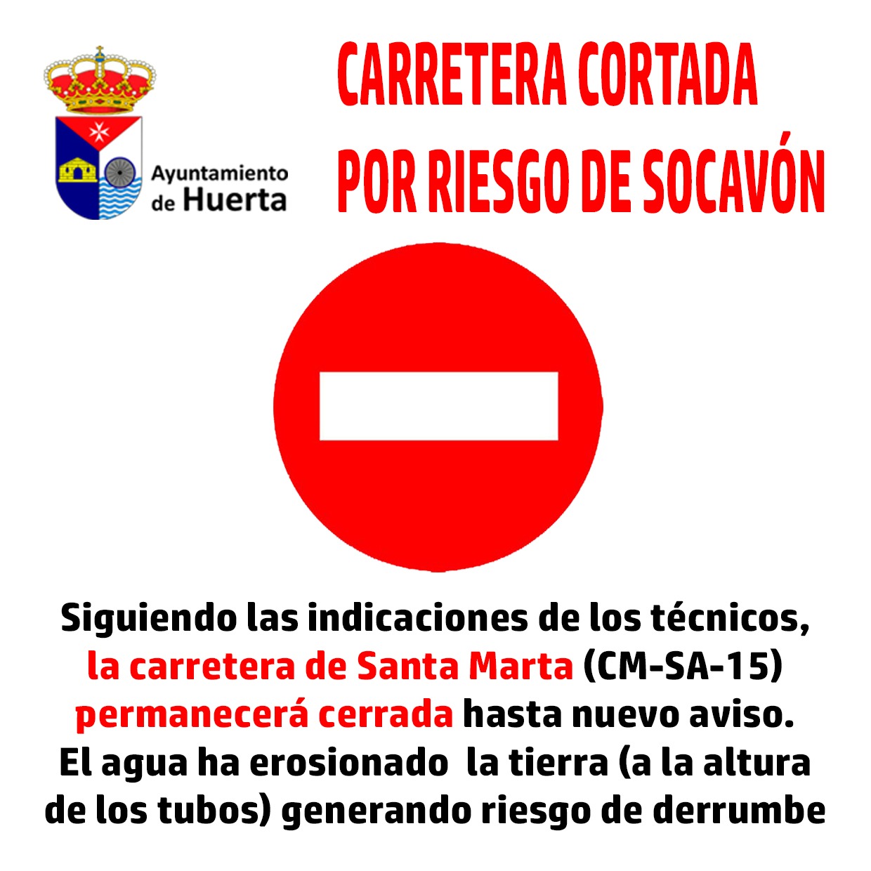 Siguiendo las indicaciones de los técnicos, la carretera de Santa Marta (CM-SA-15) permanecerá cerrada hasta nuevo aviso.El agua ha erosionado la tierra (a la altura de los tubos) generando riesgo de derrumbe
