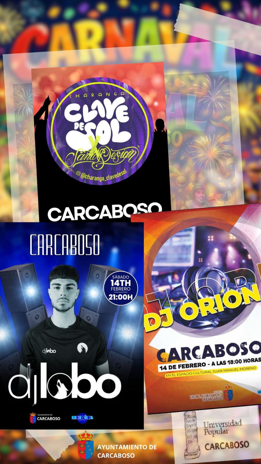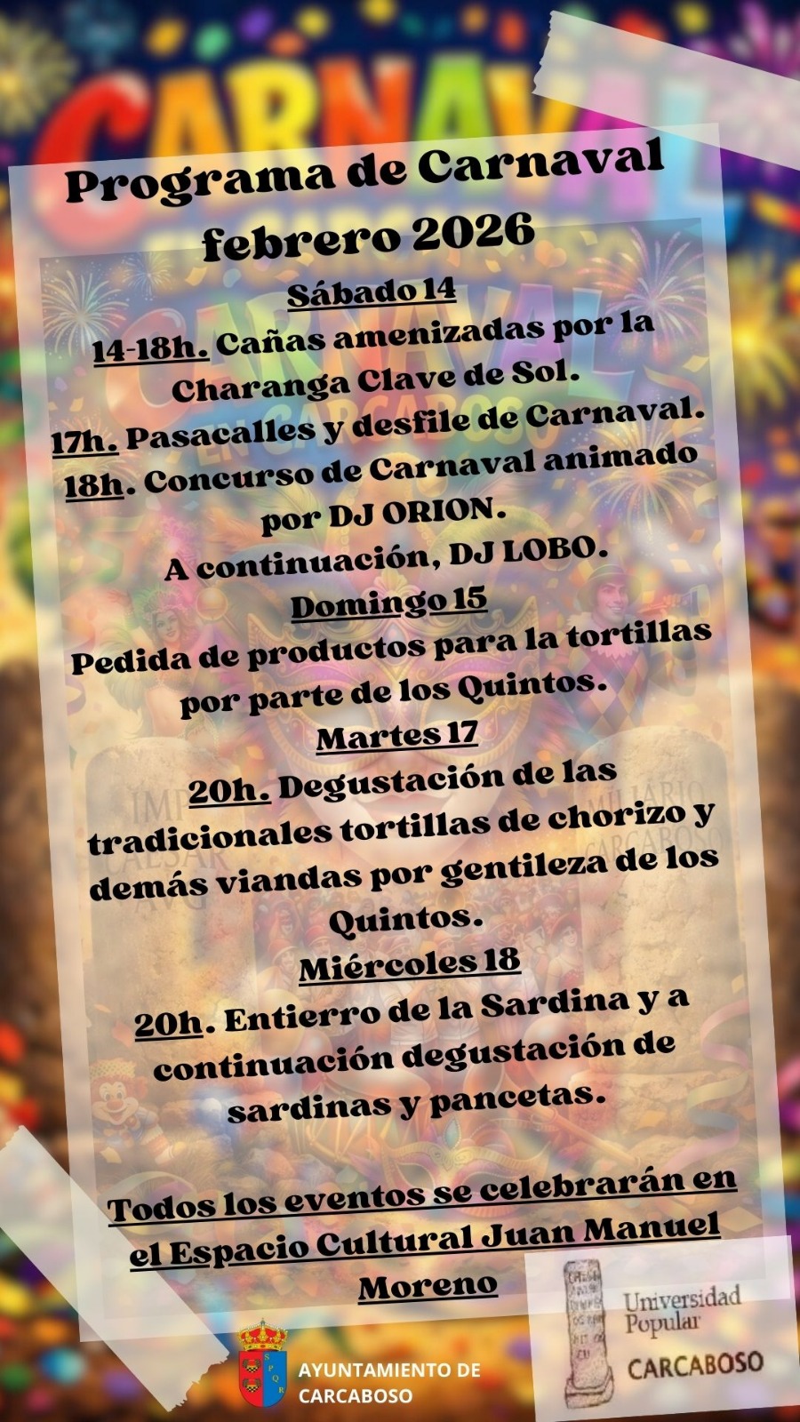 EL PRÓXIMO SÁBADO 14 DE FEBRERO EN EL ESPACIO CULTURAL JUAN MANUEL MORENO CELEBRAREMOS UN AÑO MÁS EL CARNAVAL DE CARCABOSO CON EL DESFILE Y POSTERIOR CONCURSO DE DISFRACES Y CARROZAS.
