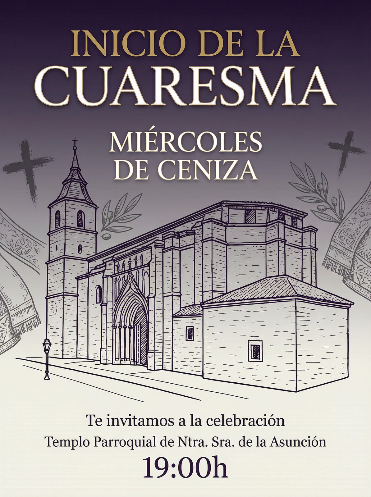 Como es habitual, con motivo de la celebración del Miércoles de Ceniza y el inicio de la Cuaresma, se celebrará una eucaristía en la Parroquia de Ntra. Sra. de la Asunción