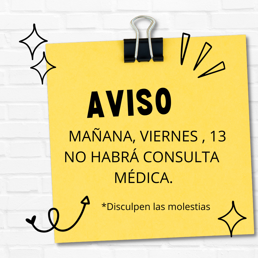 📢 MAÑANA VIERENES, 13 NO HABRÁ CONSULTA MÉDICA.