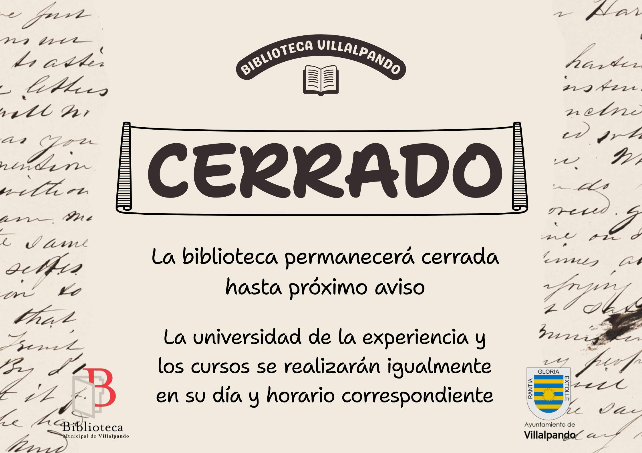 La biblioteca permanecerá cerrada desde hoy hasta nuevo aviso.