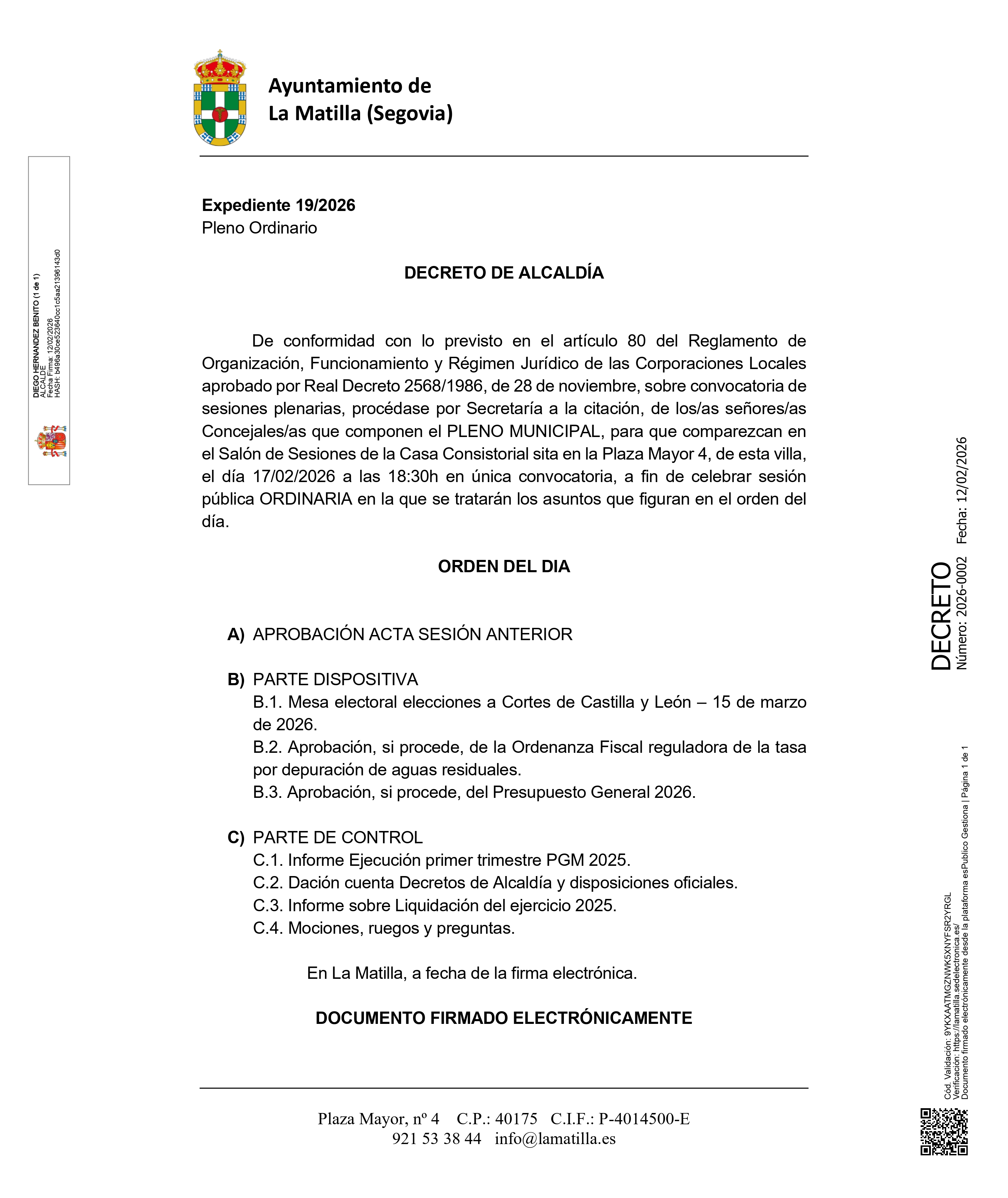 📄 En el orden del dÃa se abordarán, entre otros asuntos, la aprobación del acta de la sesión anterior, la designación de la Mesa Electoral para las Elecciones a Cortes de Castilla y León del próximo 15 de marzo de 2026, la aprobación de la Ordenanza Fiscal reguladora de la tasa por depuración de aguas residuales y del Presupuesto General para el ejercicio 2026, asà como el informe de ejecución del primer trimestre del PGM 2025, la dación de cuenta de los Decretos de AlcaldÃa y disposiciones oficiales, el informe sobre la liquidación del ejercicio 2025 y el turno de mociones, ruegos y preguntas.