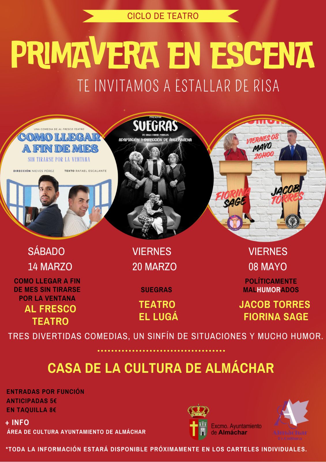 Desde el Área de Cultura del Ayuntamiento de Almáchar te invitamos a disfrutar de tres divertidas comedias dentro del ciclo “Primavera en Escena”.
