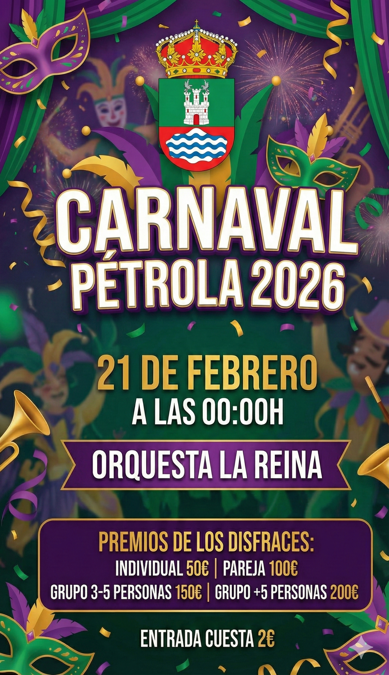 Este sábado 21 de febrero a las 00:00h celebramos el Carnaval 2026 a lo grande. Contaremos con la espectacular Orquesta La Reina para ponerle ritmo a la noche.