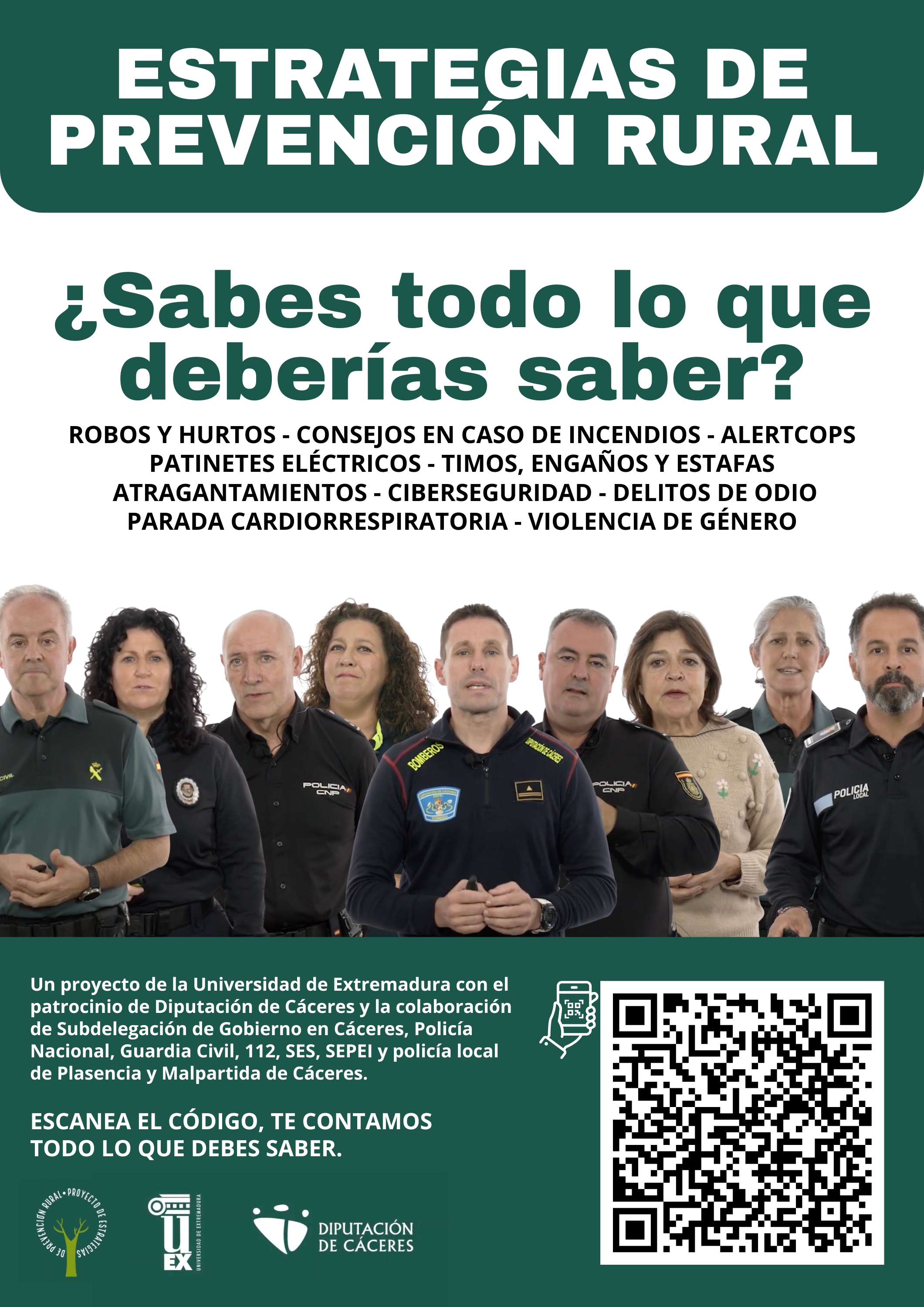 La Diputación de Cáceres, en colaboración con la Universidad de Extremadura, ha puesto en marcha el proyecto denominado "Estrategias de Prevención Rural". Se trata de píldoras informativas en formato vídeo sobre asuntos de gran interés y con un un enfoque práctico pensado para el medio rural de la provincia de Cáceres.