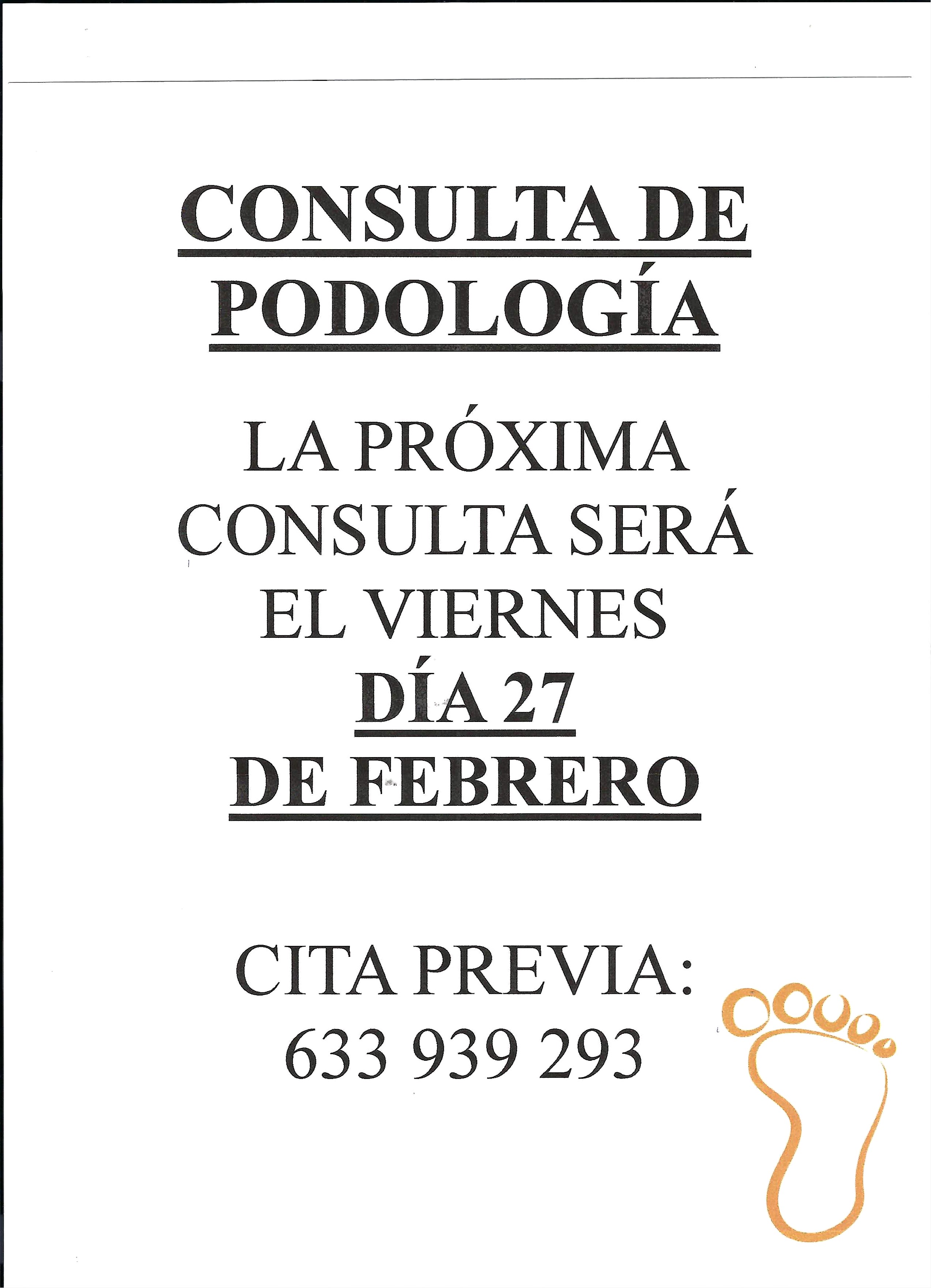LA PODÓLOGA INFORMA:LA PRÓXIMA CONSULTA DE PODOLOGÍA SERÁ, EL DÍA 27 DE FEBRERO DEL 2026 (VIERNES)Cita previa 633 939 293