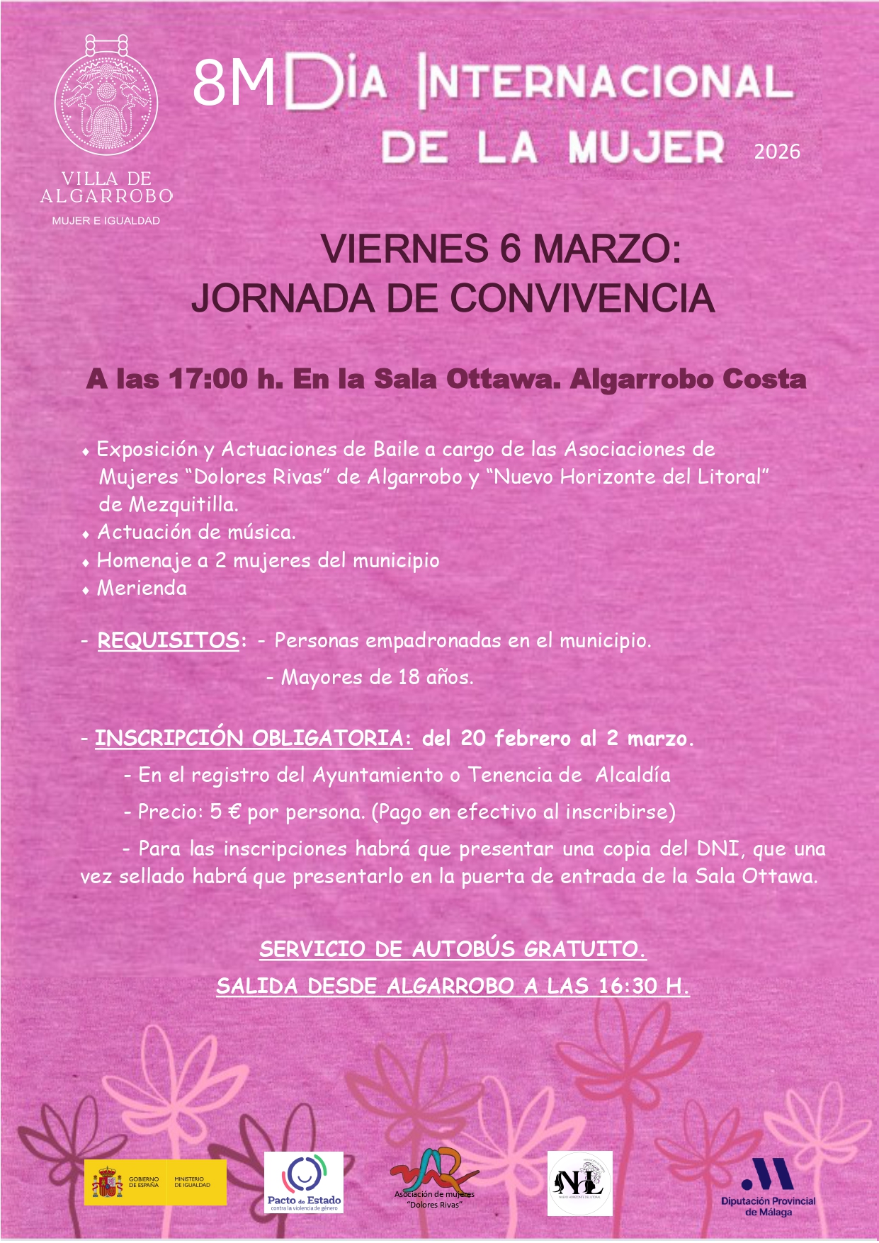 Celebramos en Algarrobo una jornada de convivencia el viernes 6 de marzo a las 17:00 h en la Sala Ottawa (Algarrobo Costa), con exposición y actuaciones de baile a cargo de las Asociaciones de Mujeres “Dolores Rivas” de Algarrobo y “Nuevo Horizonte del Litoral” de Mezquitilla, actuación musical, homenaje a dos mujeres del municipio y merienda compartida.