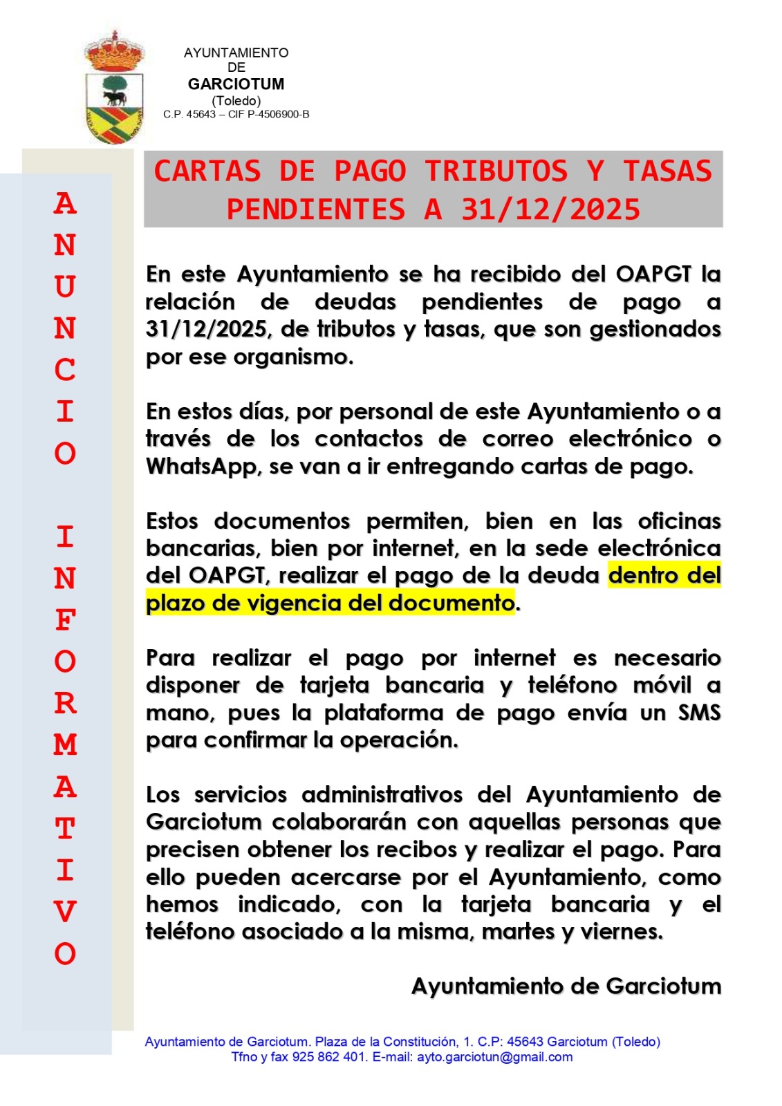 En estos días, por personal de este Ayuntamiento o a través de los contactos de correo electrónico o WhatsApp, se van a ir entregando cartas de pago.