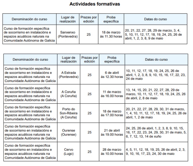 No Diario Oficial de Galicia (DOG) de hoxe, 19 de febreiro de 2026, sae publicada a RESOLUCIÓN do 11 de febreiro de 2026 pola que se convocan seis edicións do curso formación específica de socorrismo en instalacións e espazos acuáticos naturais destinado ás persoas interesadas no desenvolvemento do exercicio profesional de socorrismo na Comunidade Autónoma de Galicia