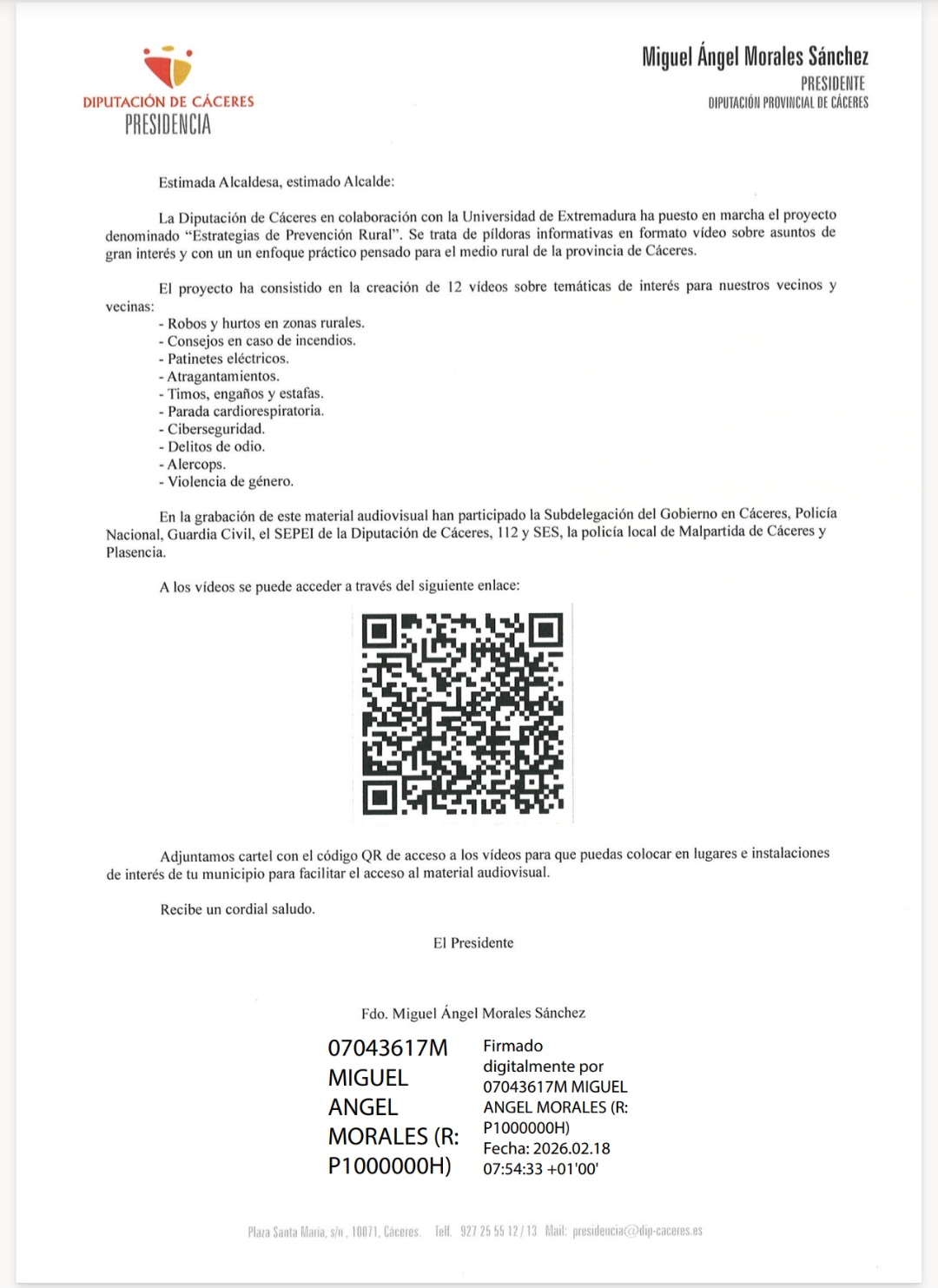 ℹ️ La Diputación de Cáceres, en colaboración con la Universidad de Extremadura, pone en marcha el proyecto "Estrategia de Prevención Rural".