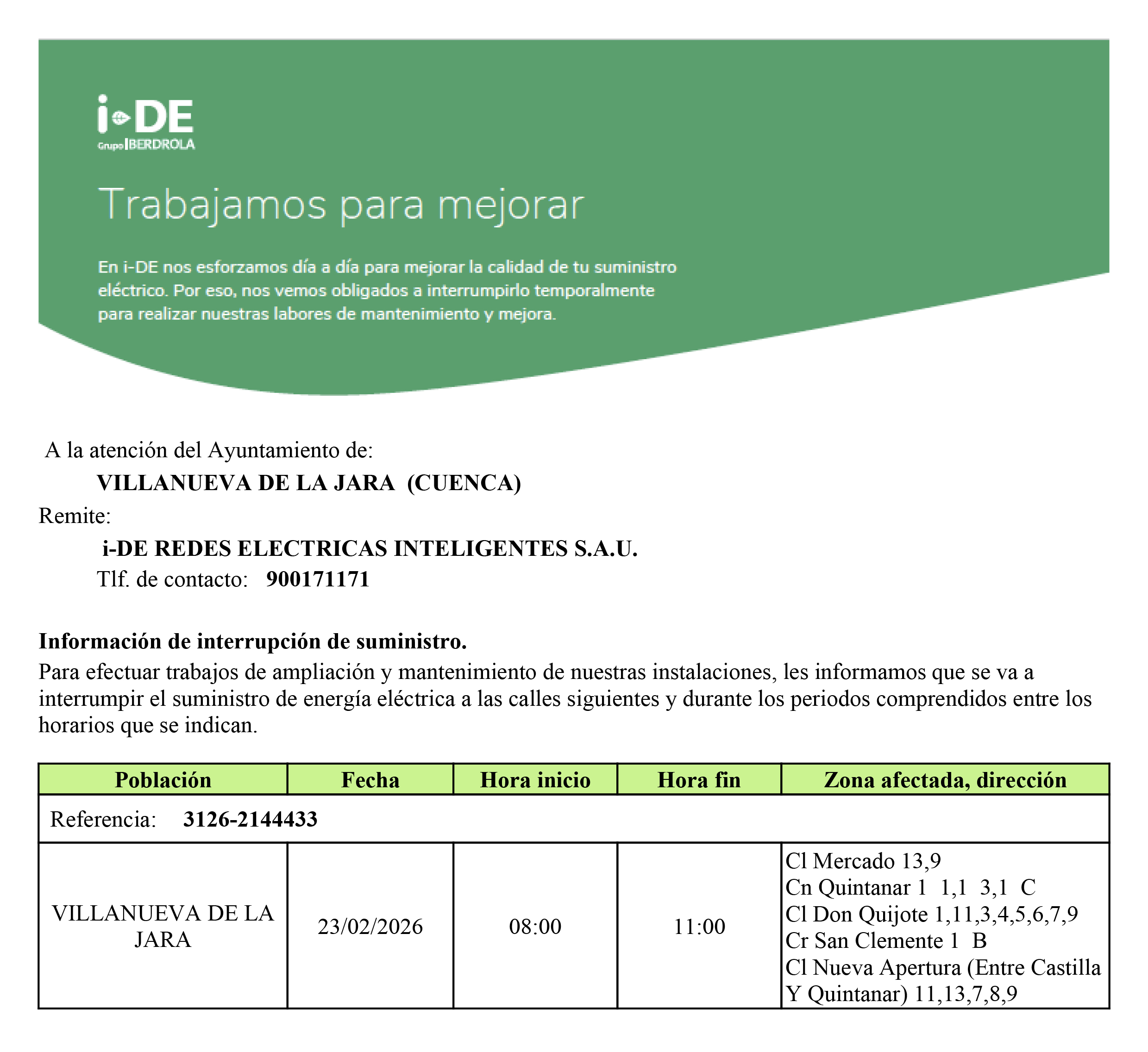 Les recordamos que mañana, 23 de febrero, está previsto un corte temporal del suministro eléctrico en Villanueva de la Jara por trabajos de ampliación y mantenimiento en la red.