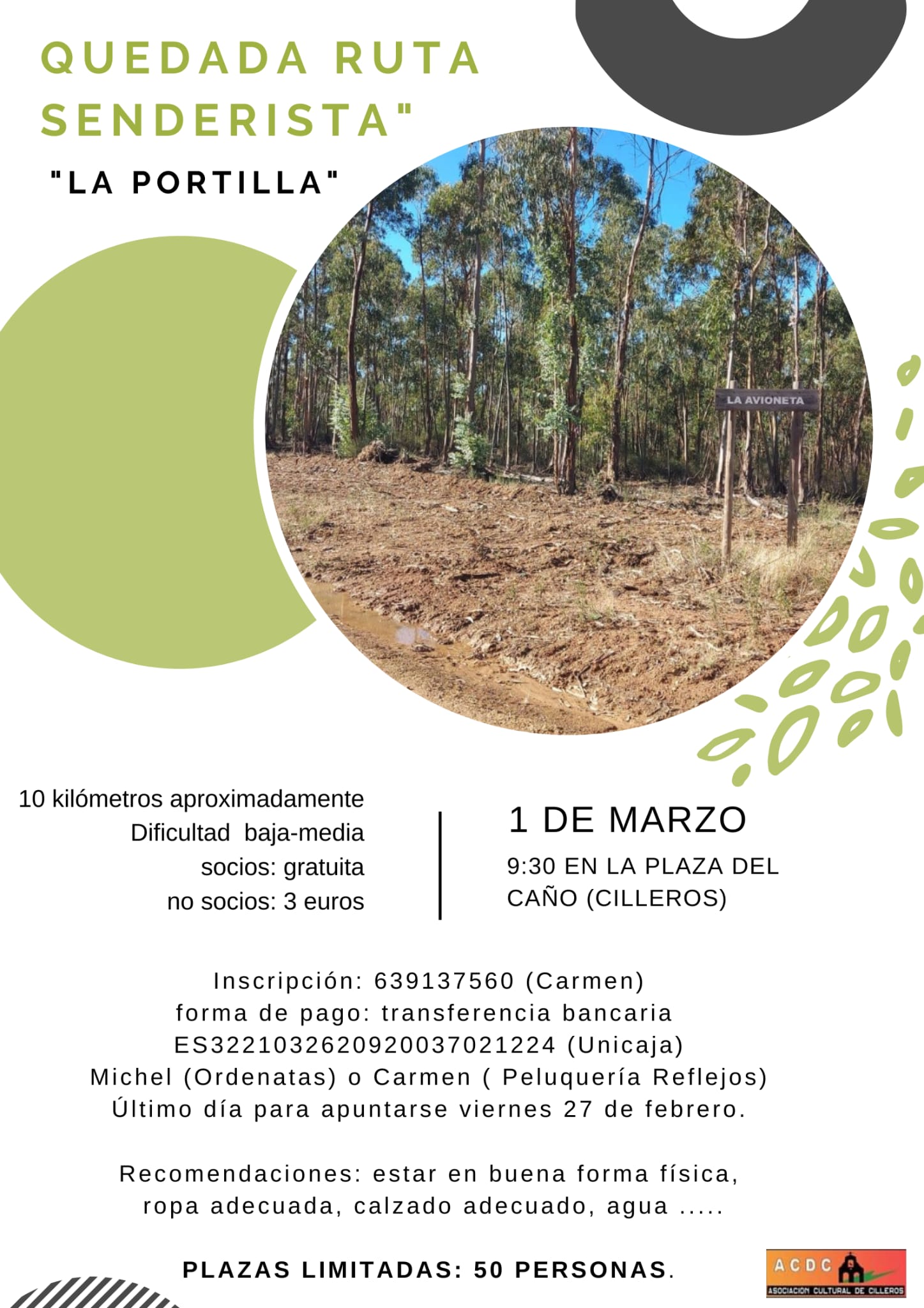 DÍA 1 DE MARZO QUEDADA RUTA SENDERISTA "LA PORTILLA", ORGANIZADA POR ACDC.SALIDA DESDE LA PLAZA DEL CAÑO A PARTIR DE LAS 9:30h.SOCIOS GRATUITA Y NO SOCIOS 3€MÁS INFORMACIÓN EN EL CARTEL ANUNCIADOR.