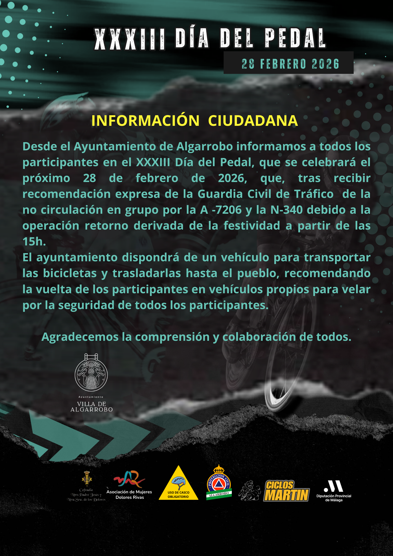 Desde el Ayuntamiento de Algarrobo 🏛️ informamos a todos los participantes 🚴♂️🚴♀️ en el XXXIII Día del Pedal 🚴, que se celebrará el próximo 28 de febrero de 2026 📅, que, tras recibir recomendación expresa de la Guardia Civil de Tráfico 🚔 de la no circulación en grupo 🚫🚴♂️🚴♀️ por la A -7206 y la N-340 🛣️ debido a la operación retorno 🚗 derivada de la festividad 🎉 a partir de las 15h ⏰.