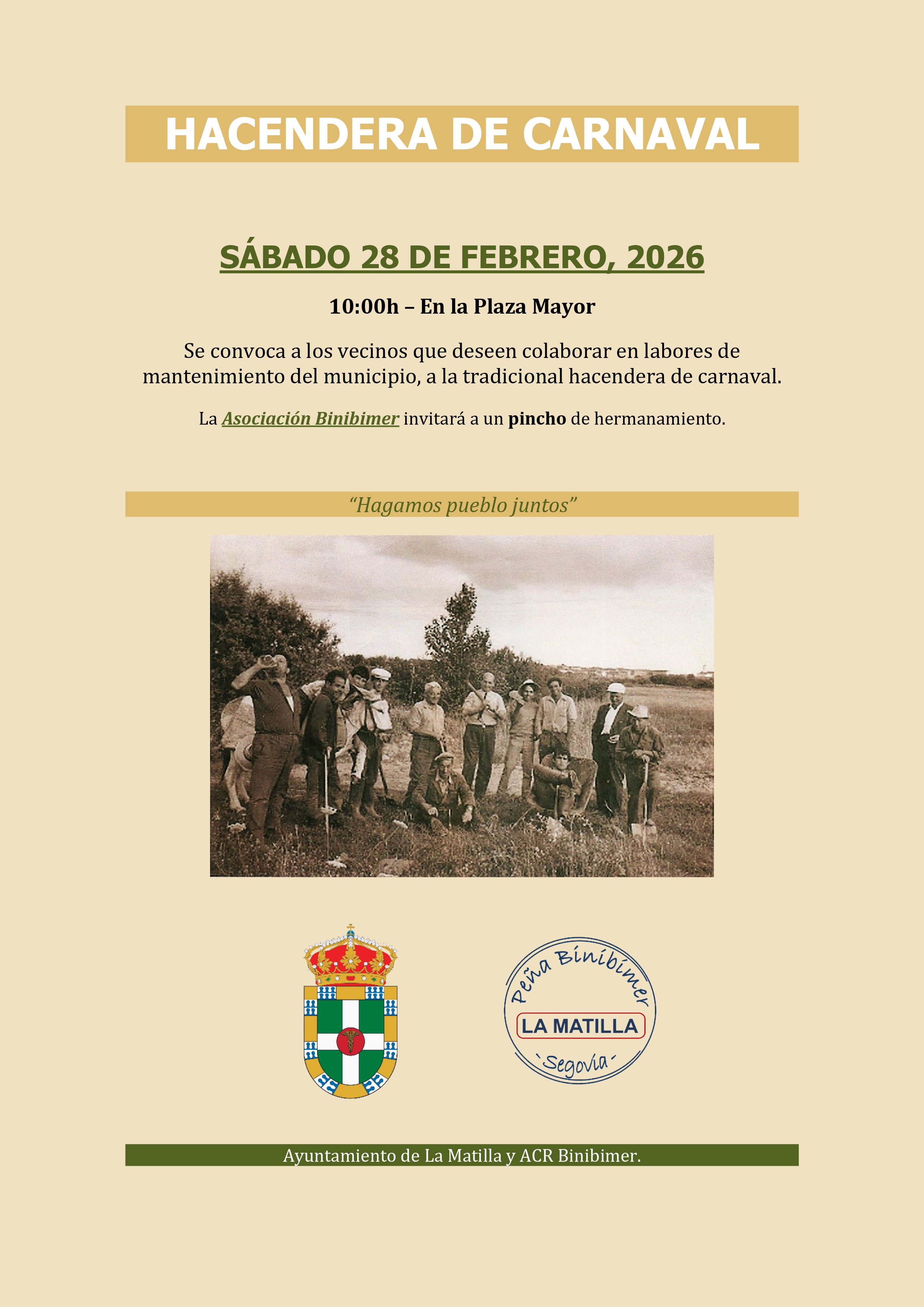 Se convoca a todos los vecinos y vecinas de La Matilla que deseen colaborar en la tradicional Hacendera de Carnaval, que tendrá lugar el próximo sábado 28 de febrero de 2026, a las 10:00 horas, en la Plaza Mayor.