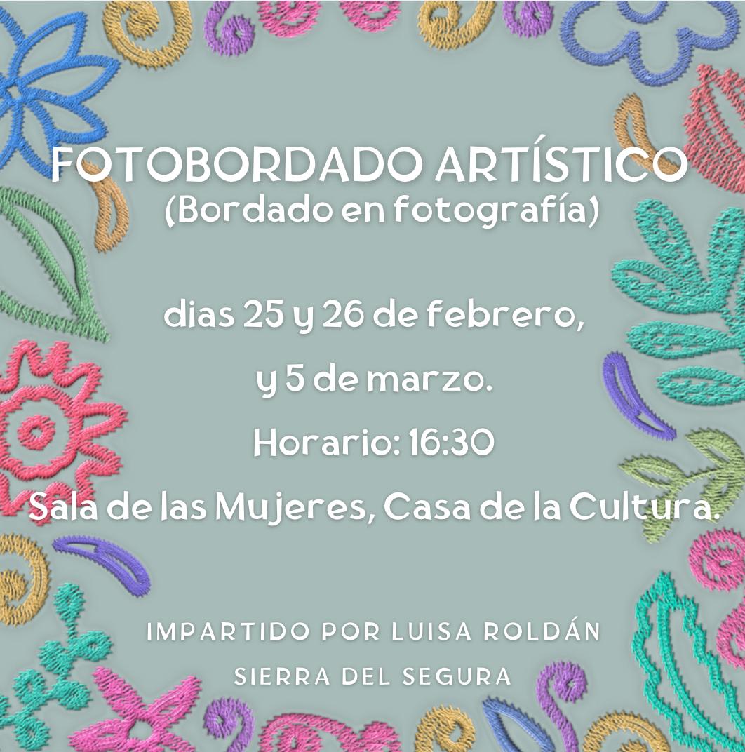 Taller de fotobordado artístico, impartido por Luisa Roldán. Se llevará a cabo los días 25, 26 de febrero y 5 de marzo, en la sala de la Asociación de Mujeres, a las 16.30h. os esperamos!!!