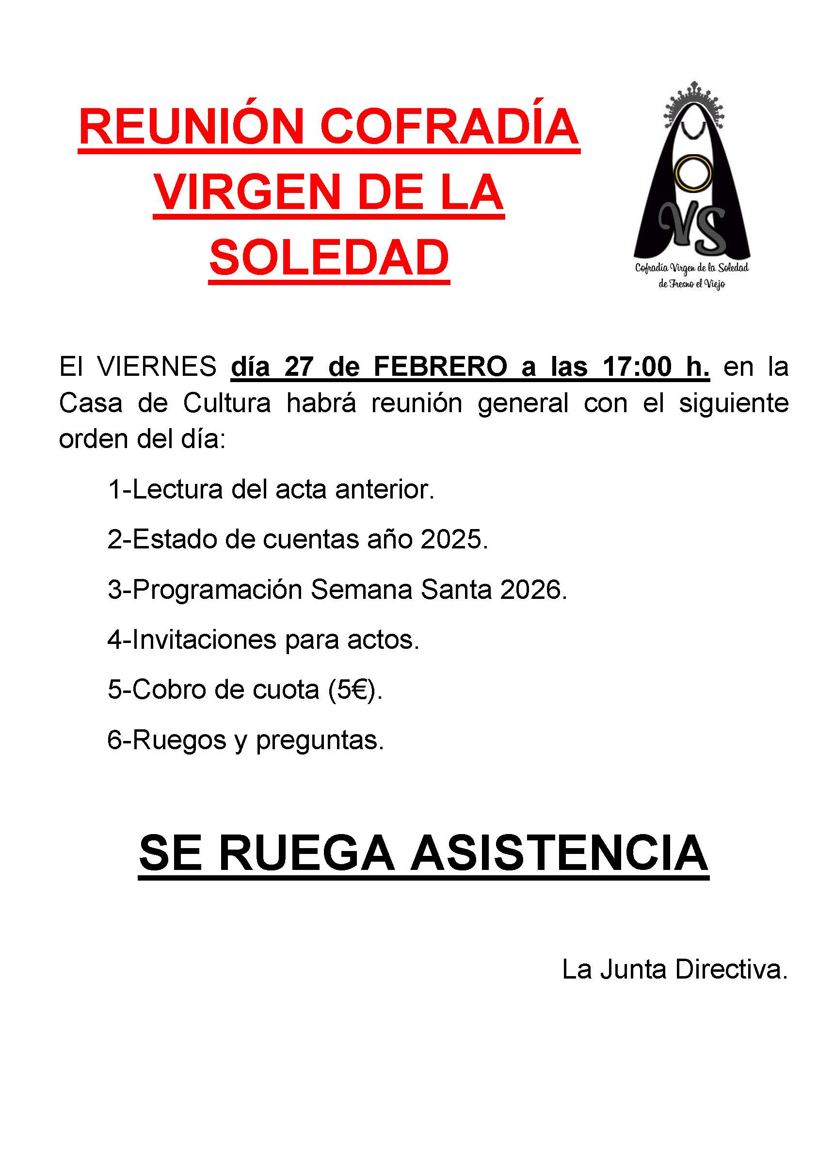 Hoy 27 de febrero se celebrará la reunión general de la Cofradía Virgen de la Soledad en la Casa de Cultura a las 17:00 h.