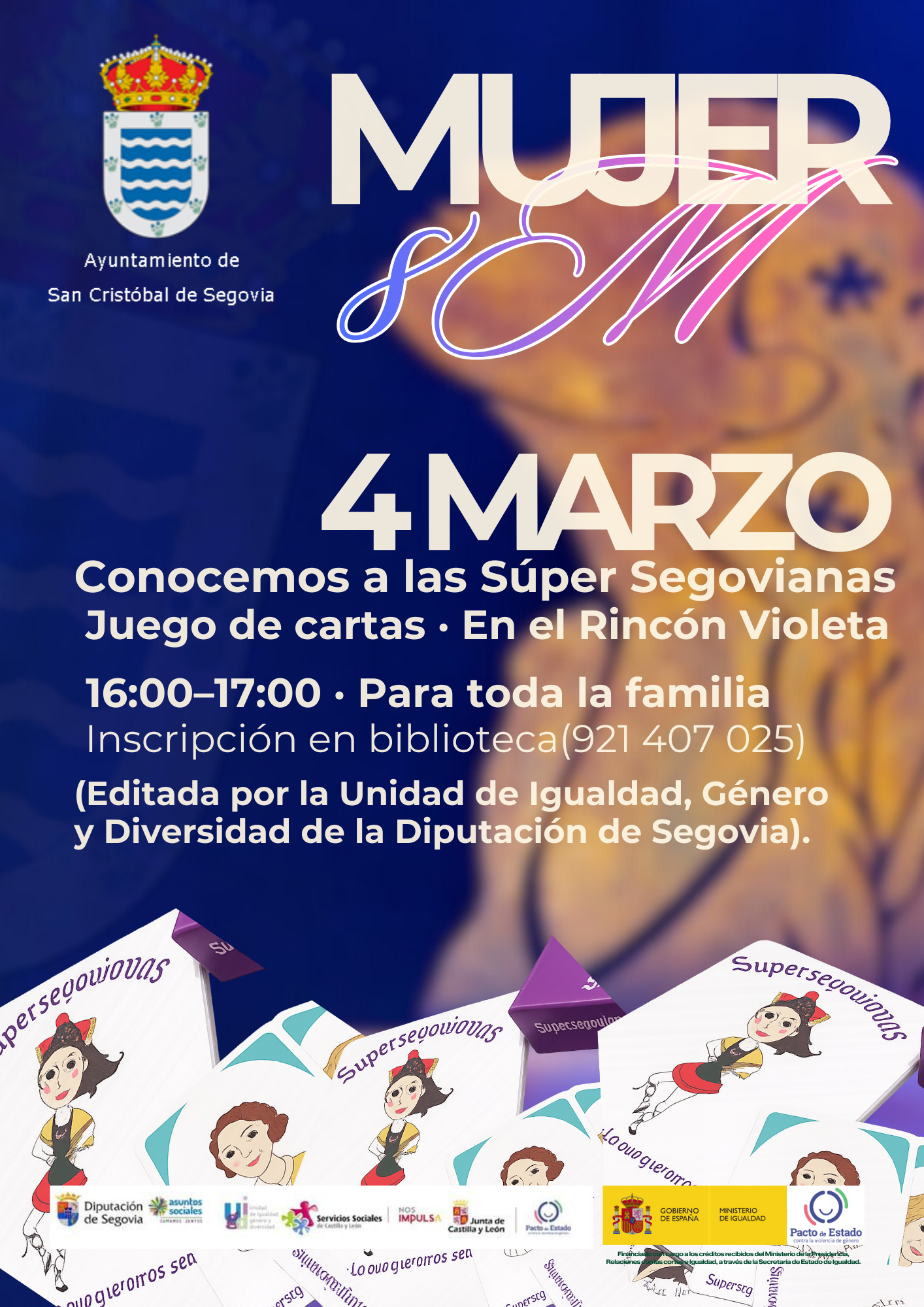 El miércoles 4 de marzo disfrutaremos en familia del divertido juego de cartas “Conocemos a las Súper Segovianas” en el Rincón Violeta, de 16:00 a 17:00. Una actividad pensada para todas las edades y con inscripción previa en la biblioteca.