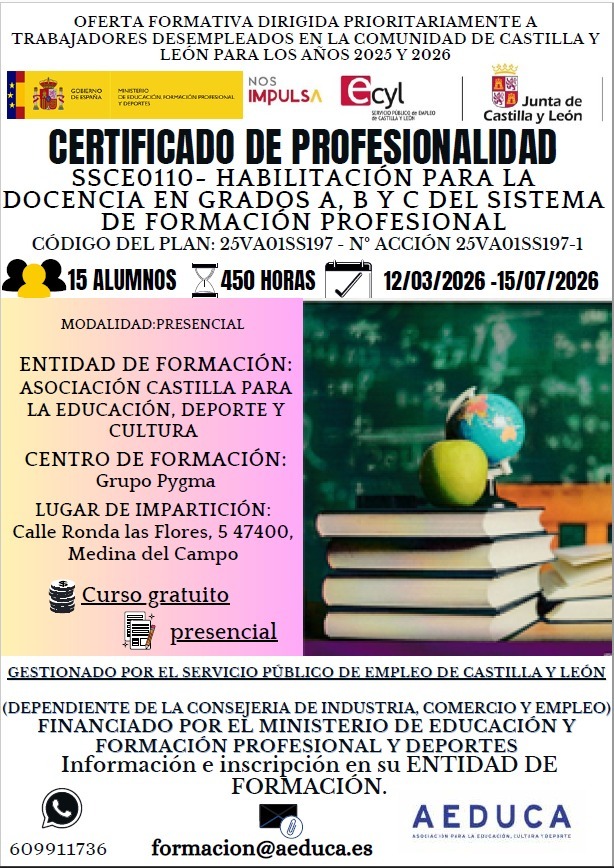 A continuación os dejamos la información sobre un curso de certificado de profesionalidad para la habilitación para la docencia de grados A, B, y C. Mas información cartel adjunto.