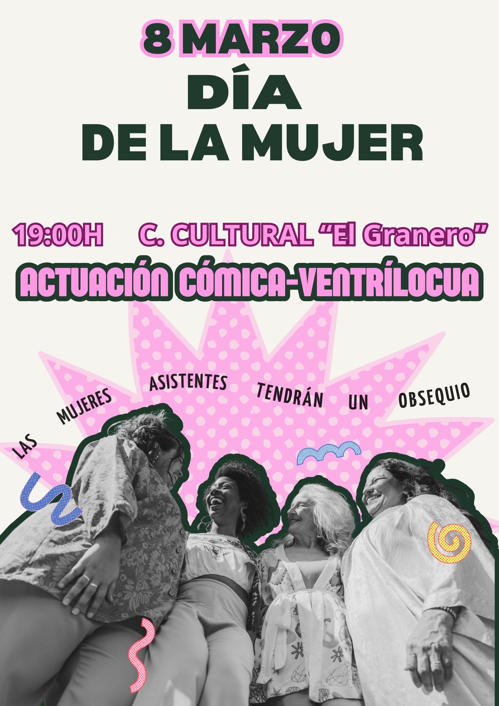 El día 8 de marzo celebramos el DÍA DE LA MUJER. Les esperamos a partir de las 19:00 horas en la Casa Cultural "EL GRANERO" para disfrutar de la actuación de una CÓMICA-VENTRÍLOCUA.