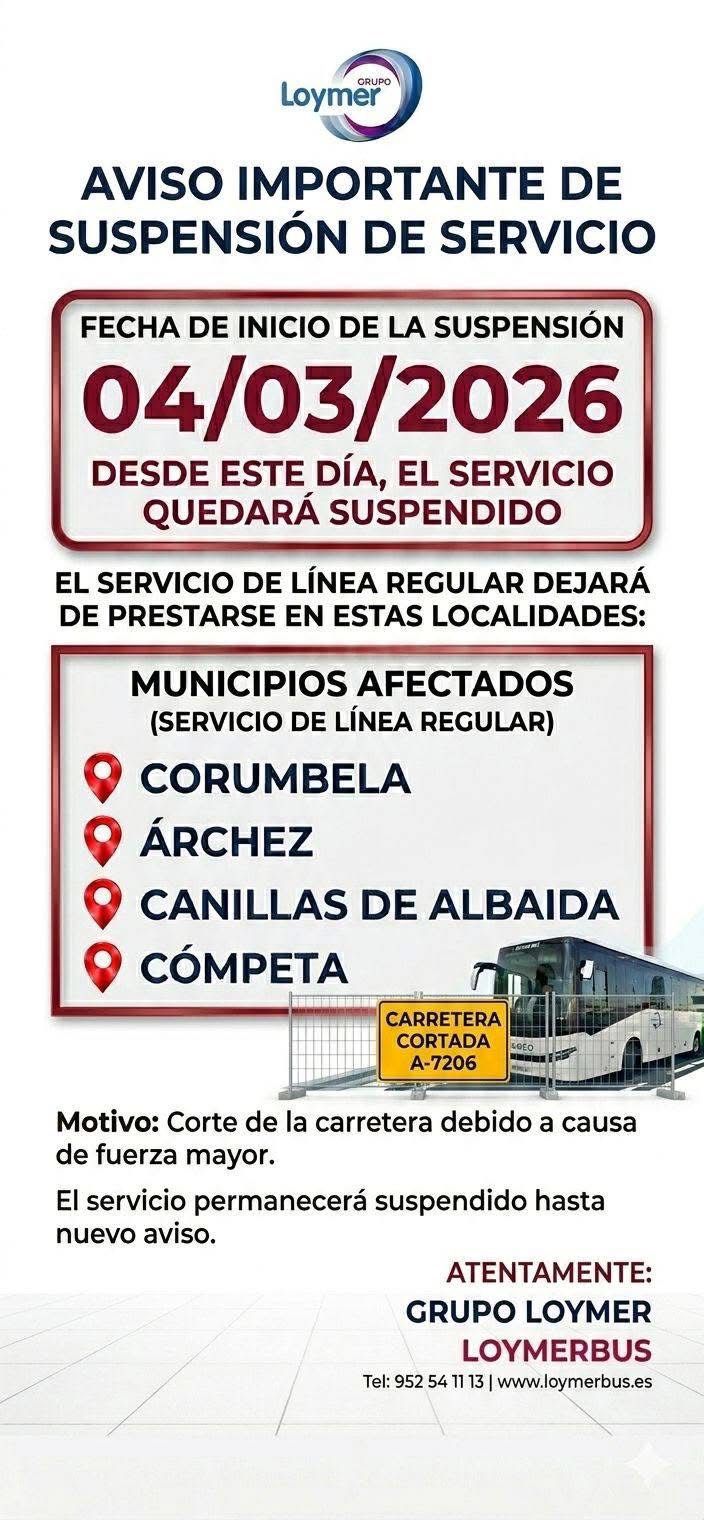 Desde los Ayuntamientos de Algarrobo, Árchez, Canillas de Albaida, Cómpeta y Sayalonga queremos trasladar un mensaje de tranquilidad 🤝 a todos los vecinos y usuarios del servicio de transporte público que presta la empresa Loymerbus, para aclarar cómo está la situación ante la publicación que dicha empresa ha hecho en sus redes sociales 📱 de corte del servicio.