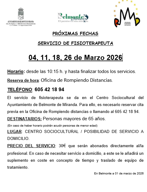 Servicio de Fisioterapeuta para el mes de MARZO.Solicita cita con antelación en el teléfono: 605 42 18 94.