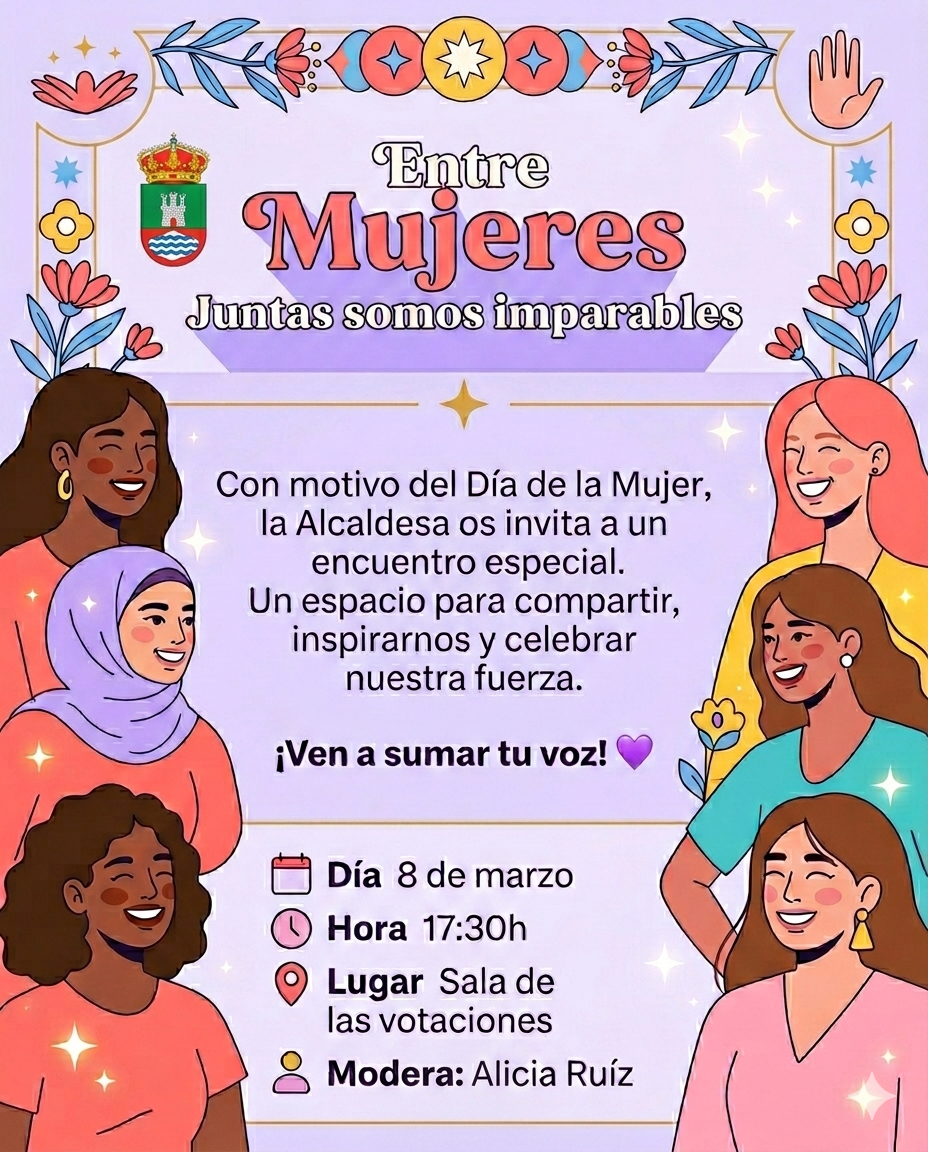 Por ello, la Alcaldesa os invita a una reunión muy especial diseñada por y para nosotras. Queremos crear un espacio cercano donde nuestras voces resuenen, donde podamos compartir nuestras historias, inspirarnos mutuamente y seguir construyendo un futuro lleno de oportunidades.