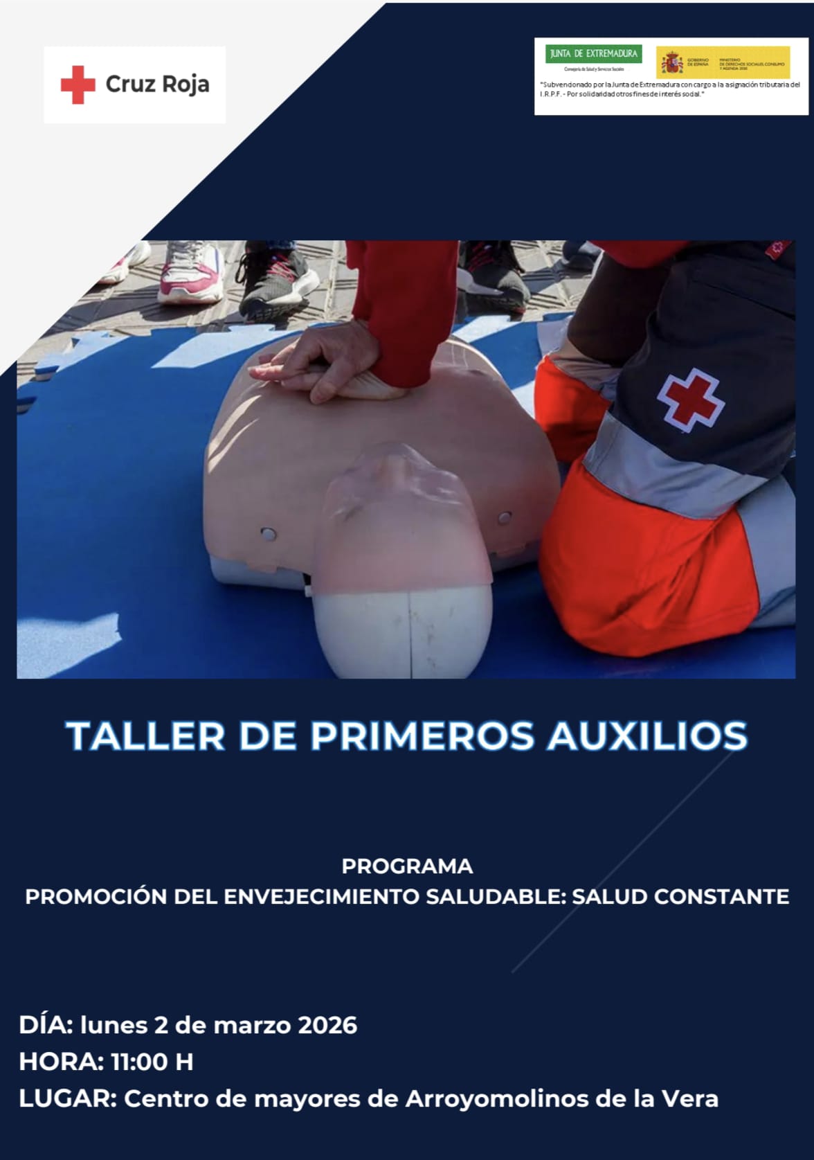 Se recuerda que mañana lunes, día 2 de marzo, a las 11:00 de la mañana se realizará un taller de primeros auxilios en el centro de mayores.Se adjunta cartel.
