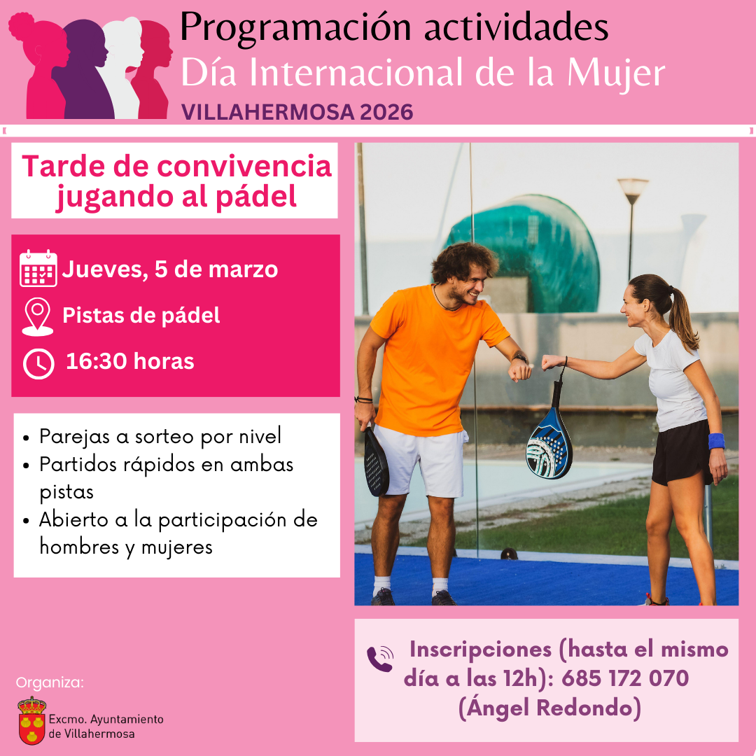 Dentro de la programación de actividades conmemorativas por el Día Internacional de la Mujer hemos organizado una jornada de pádel donde hombres y mujeres podrán disfrutar de una tarde de convivencia y buen ambiente.