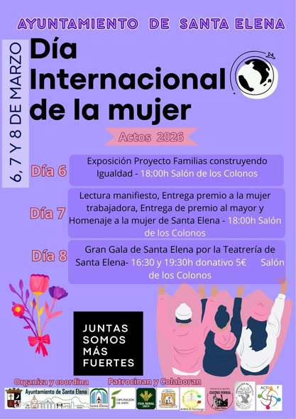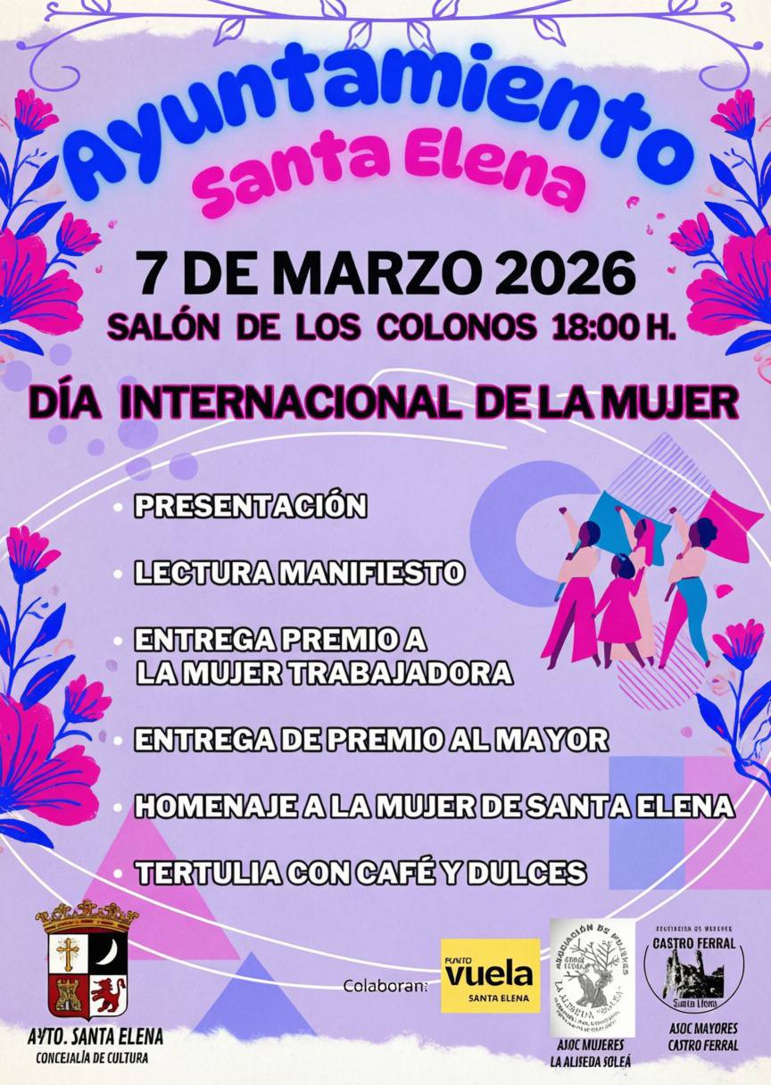 Desde el Ayuntamiento de Santa Elena, concejalía de Igualdad os presentamos las siguientes actividades que se desarrollaran con motivo del Día Internacional de la Mujer Trabajadora, 8 de marzo.